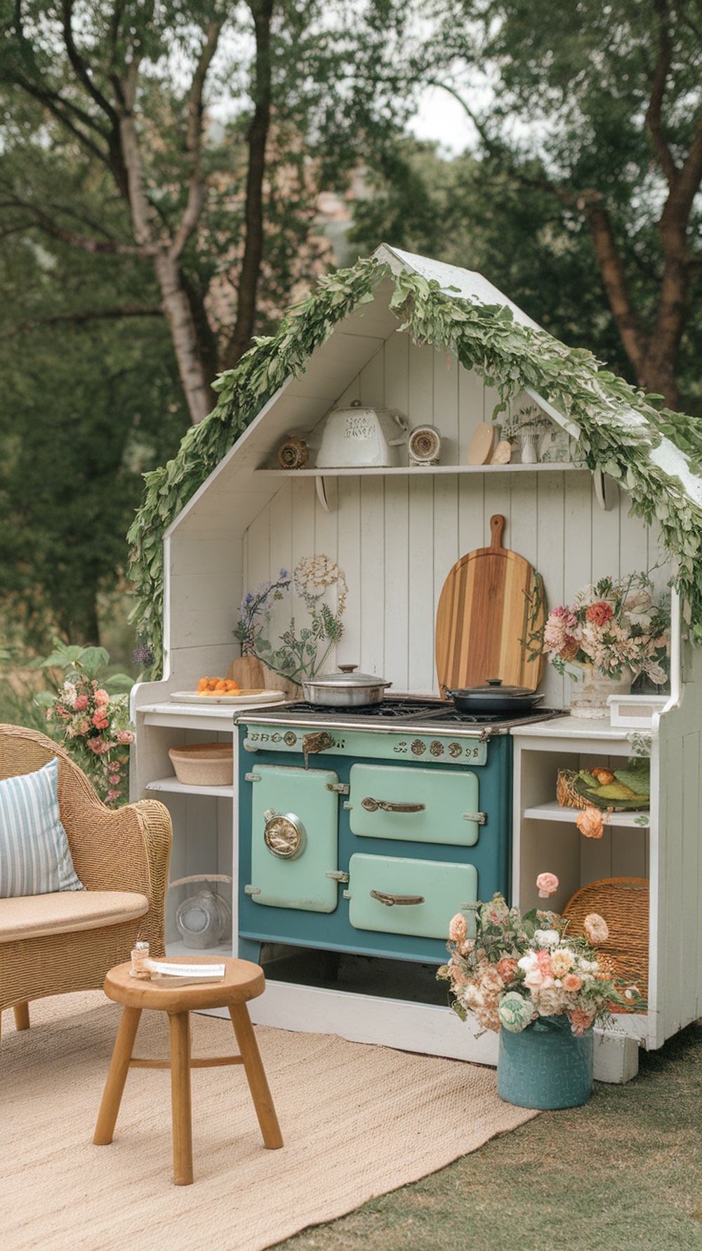 This setup is perfect for those who love to entertain. Imagine grilling up some burgers or baking a pie while friends gather around the table. The combination of vintage appliances and lively decor makes this outdoor kitchen a delightful spot for culinary creativity.