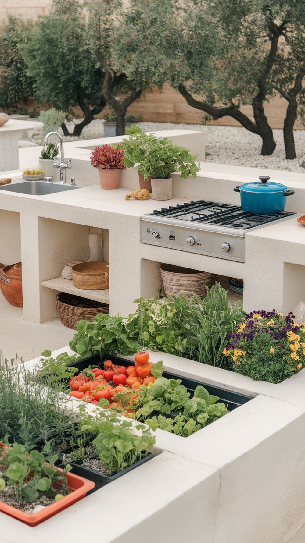 Imagine stepping into a space where cooking meets nature. This outdoor kitchen is not just about grilling; it’s a culinary garden that brings fresh ingredients right to your fingertips. The setup features a sleek grill and a sink, making it easy to prepare meals while surrounded by greenery.