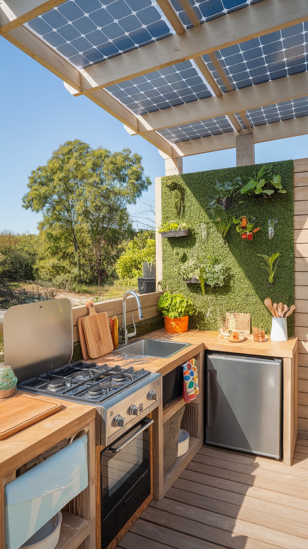 Imagine cooking outdoors while being kind to the planet. This eco-friendly outdoor kitchen is a perfect example of how to blend functionality with sustainability. The kitchen features solar panels above, harnessing the sun’s energy to power appliances. This setup reduces reliance on traditional energy sources, making it a smart choice for eco-conscious cooks.