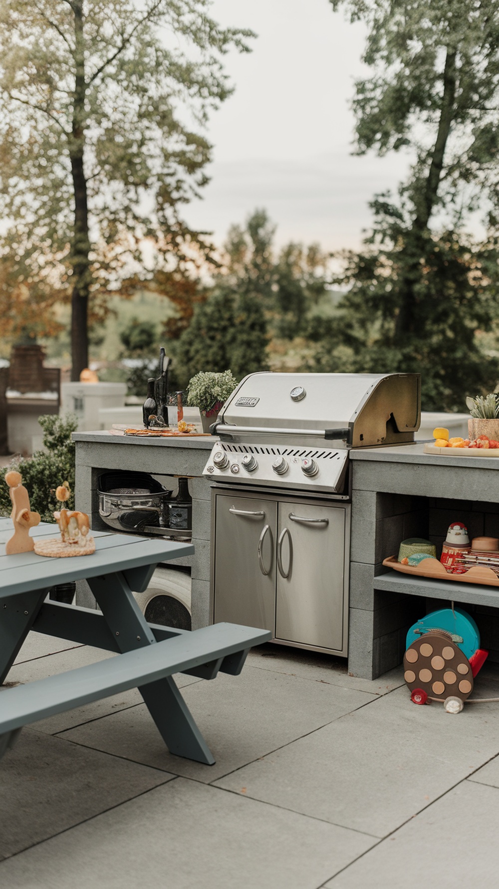 Nearby, a wooden picnic table invites everyone to gather and enjoy the feast. This outdoor kitchen is not just about cooking; it’s about creating memories. Whether it’s a weekend barbecue or a casual weeknight dinner, this grill station is the heart of outdoor gatherings.