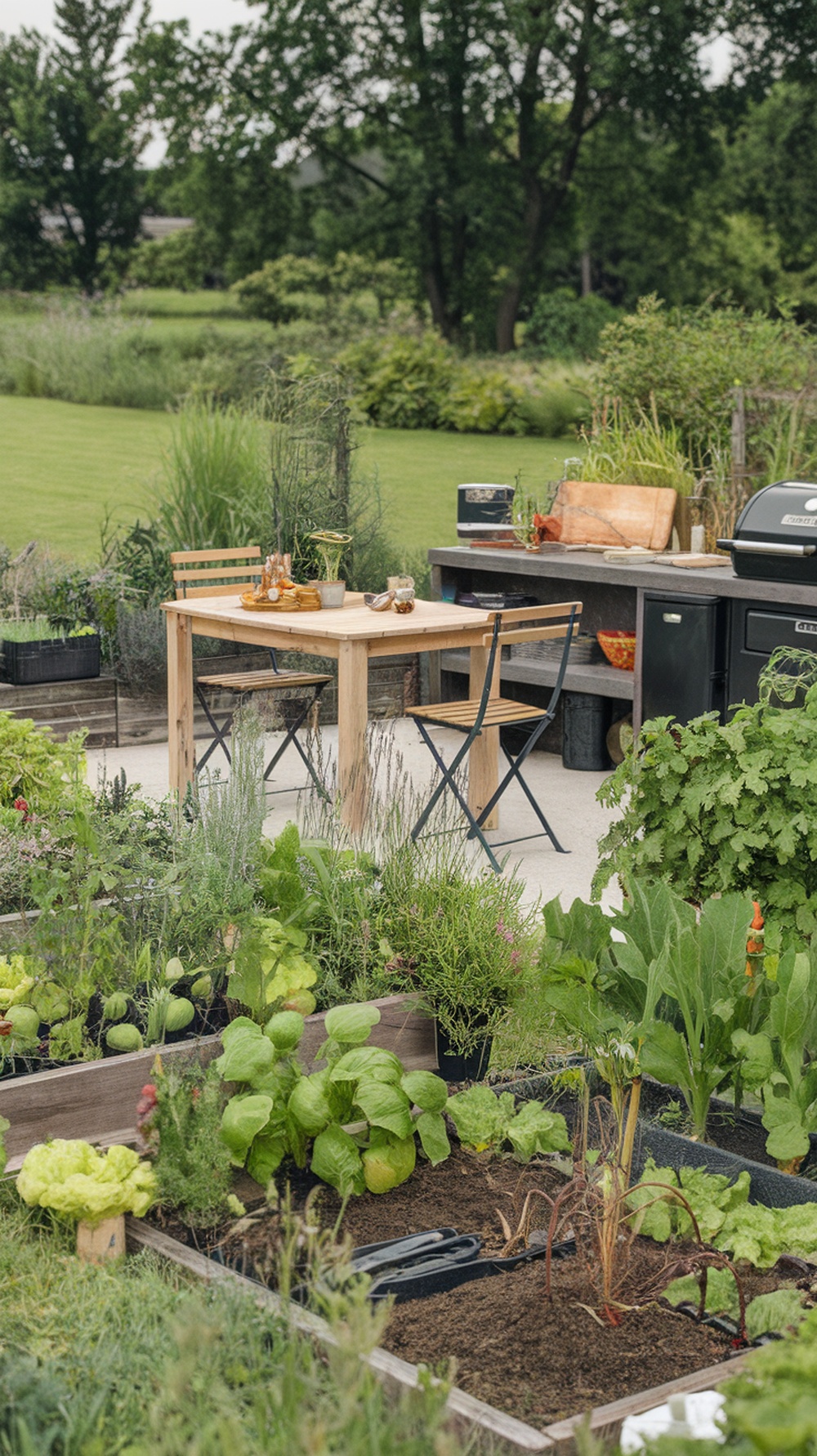 Imagine stepping into a garden where fresh ingredients are just a few steps away. This outdoor kitchen setup is perfect for those who love cooking with homegrown produce. The wooden table invites you to sit down and enjoy a meal surrounded by lush greenery.