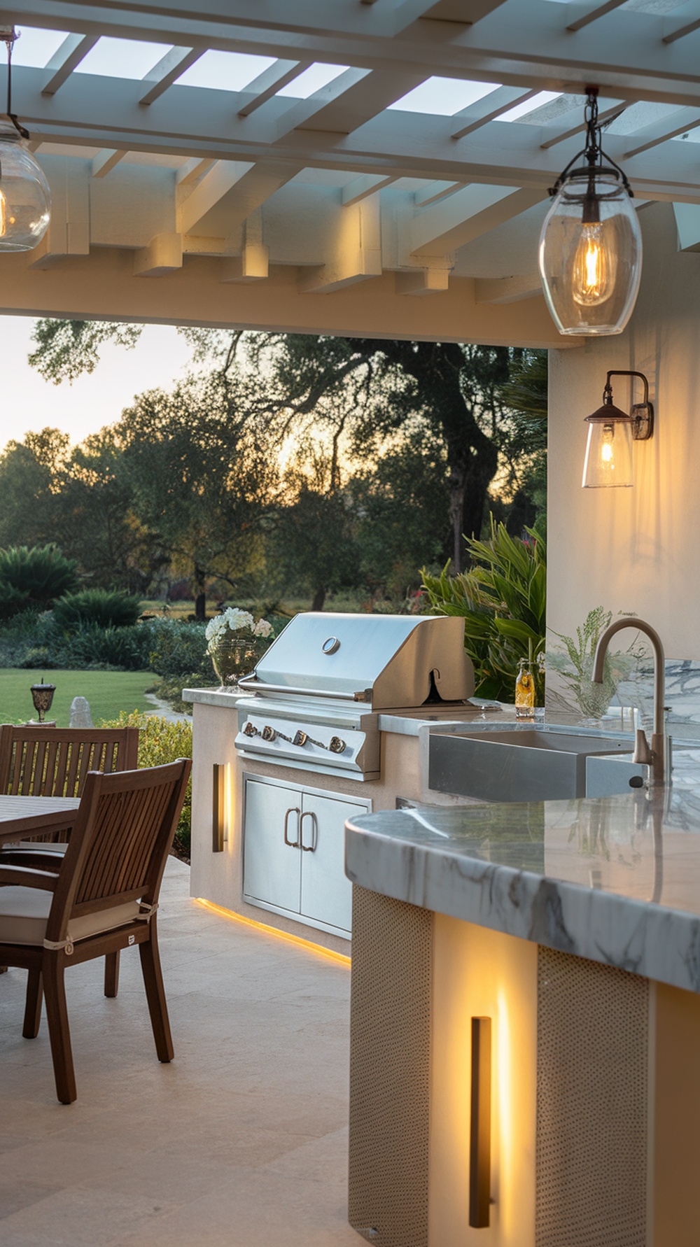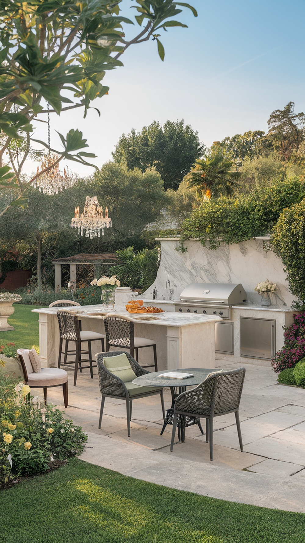 Imagine stepping into a stunning outdoor kitchen that feels like a slice of paradise. This space is designed for those who appreciate the finer things in life. The marble countertops shine under the sun, creating a perfect spot for preparing delicious meals.