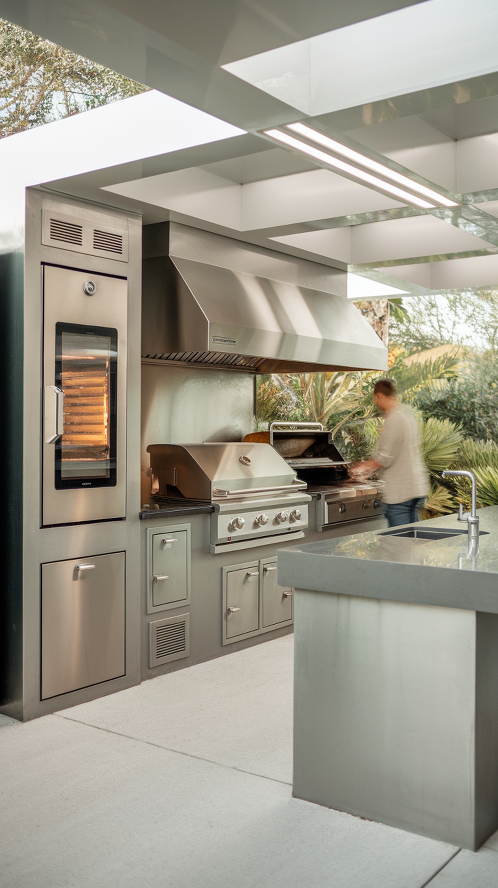 Imagine stepping into a sleek outdoor kitchen that feels like a chef’s paradise. This high-tech cooking area is designed for those who love to grill and entertain. With shiny stainless steel appliances, it’s not just about looks; it’s about functionality too.
