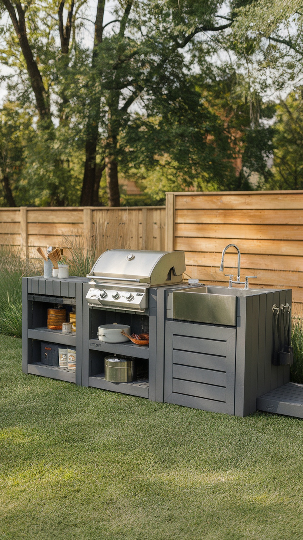 This outdoor kitchen is a perfect blend of style and functionality. The sleek gray cabinetry stands out against the lush green grass, making it a focal point in any backyard. The grill takes center stage, inviting you to fire up some delicious meals.