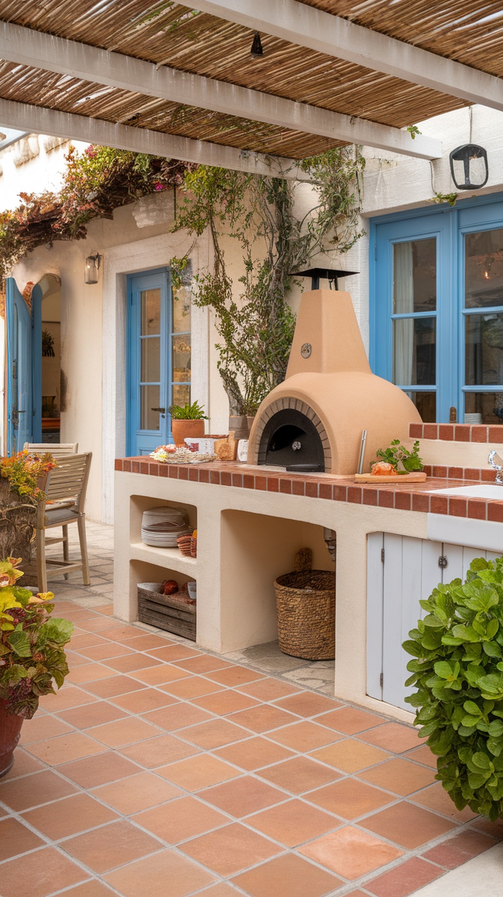 Picture a cozy outdoor kitchen that brings the charm of the Mediterranean right to your backyard. This space features a stunning clay oven, perfect for baking bread or roasting vegetables. The warm tones of the terracotta tiles and the rustic cabinetry create a welcoming vibe.