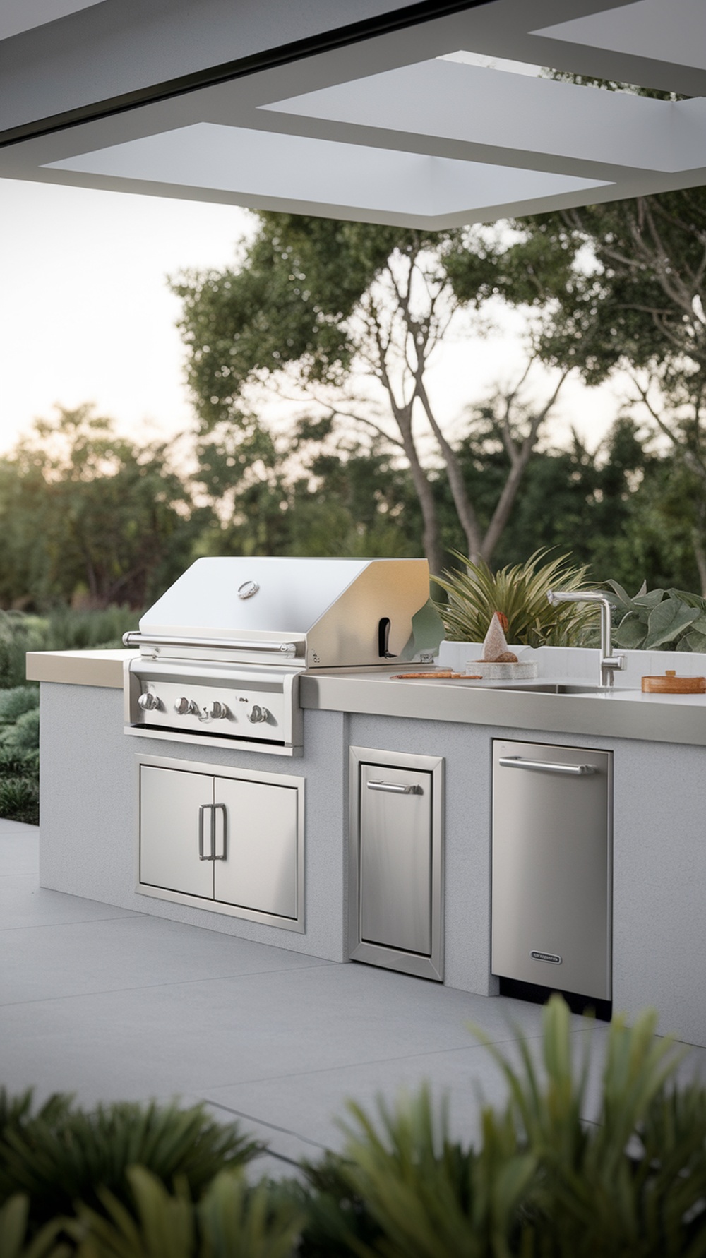 Picture a sleek outdoor kitchen that blends seamlessly with nature. This modern minimalist design features clean lines and a simple color palette. The stainless steel grill stands out, ready for your next barbecue. With a spacious countertop, it’s perfect for prepping meals or serving drinks.