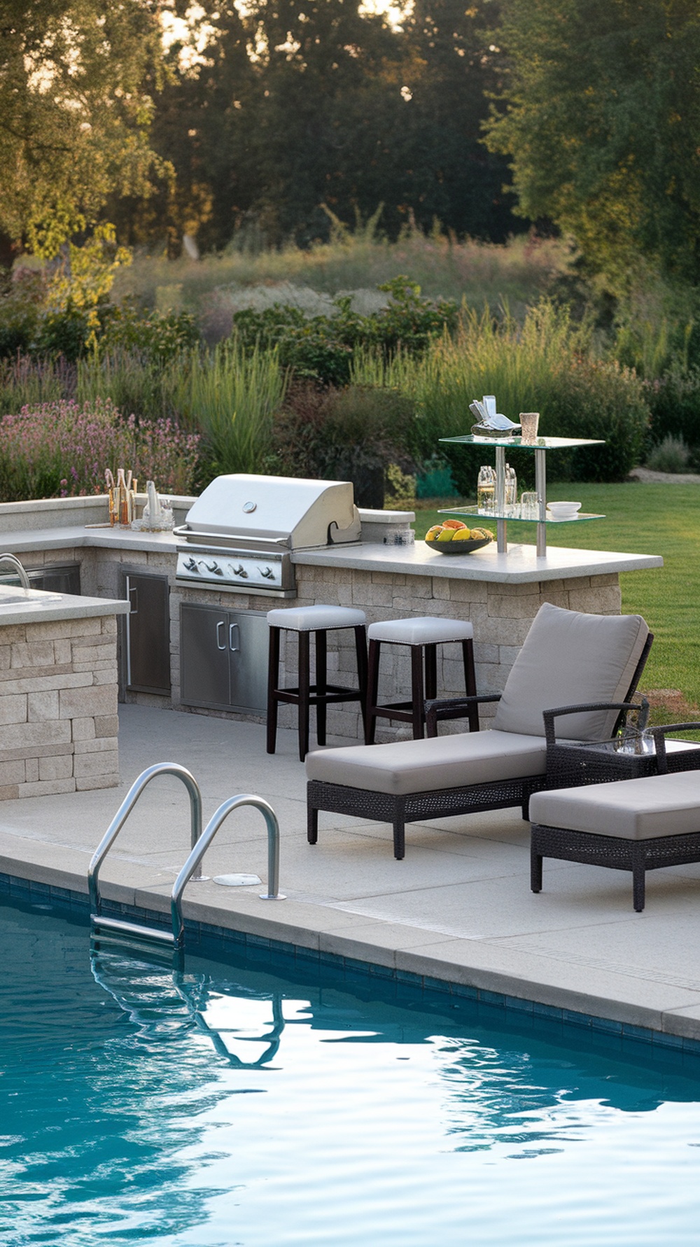 Picture a sunny day by the pool, where relaxation meets culinary delight. This outdoor kitchen, complete with a poolside bar, is the perfect spot for gatherings with friends and family. The sleek grill invites you to fire up some burgers or veggies, while the bar area is ready for refreshing drinks.