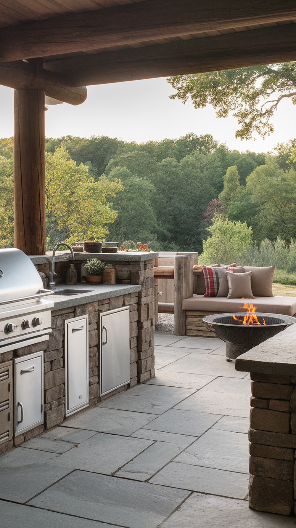 Nearby, a comfortable seating area invites relaxation. Plush cushions and a fire pit add to the charm, creating a perfect spot for evening chats under the stars. The surrounding greenery enhances the natural vibe, making this outdoor kitchen a true escape.