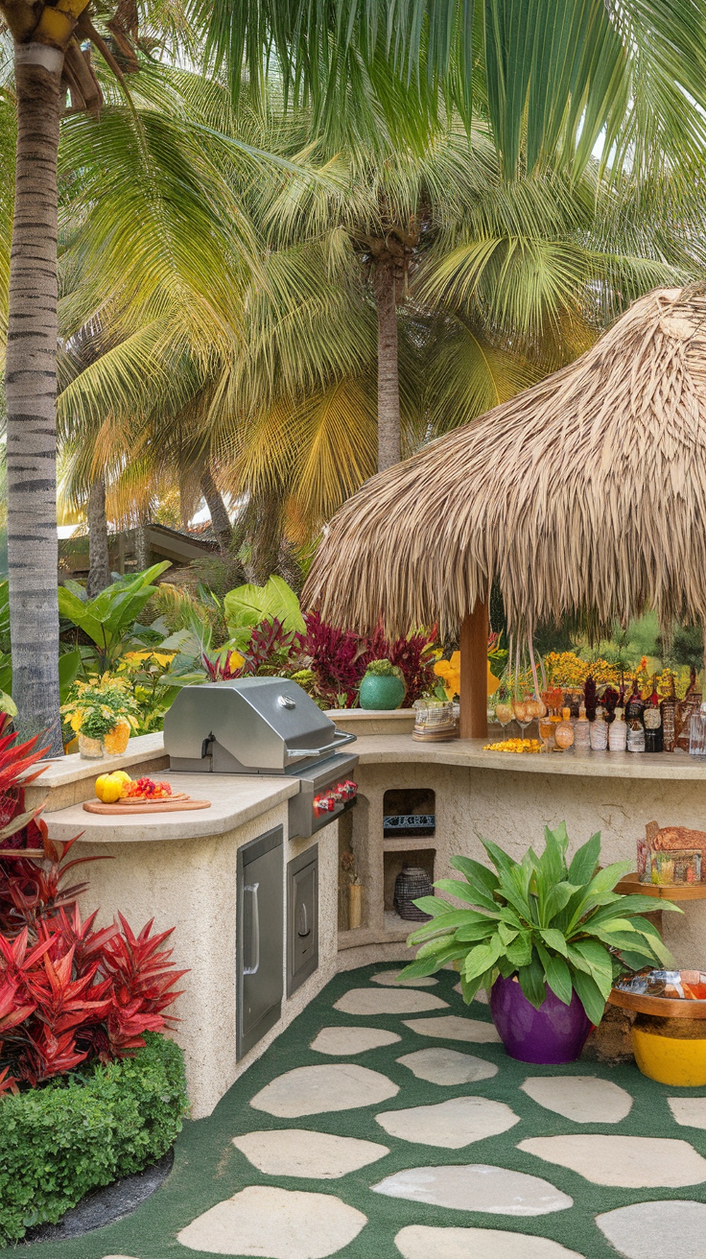 Imagine stepping into a tropical paradise right in your backyard. This outdoor kitchen is a perfect blend of style and functionality. The lush greenery surrounding it adds a vibrant touch, making it feel like a getaway.