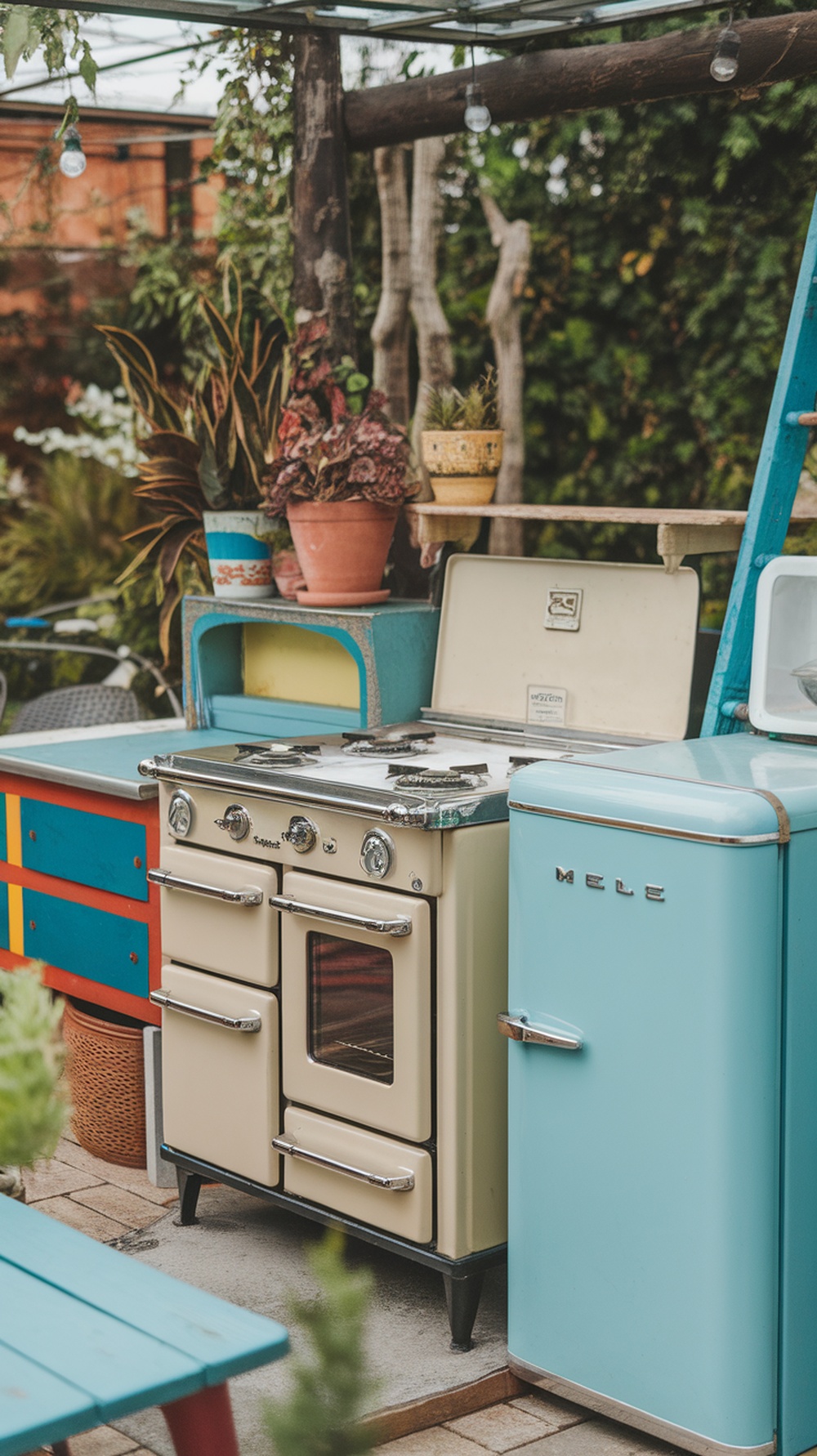 This outdoor cooking area brings a charming vintage vibe that feels both nostalgic and inviting. The retro stove, with its classic design, stands as the centerpiece, ready to whip up delicious meals. Its soft cream color contrasts beautifully with the vibrant blue fridge nearby, creating a playful yet cohesive look.