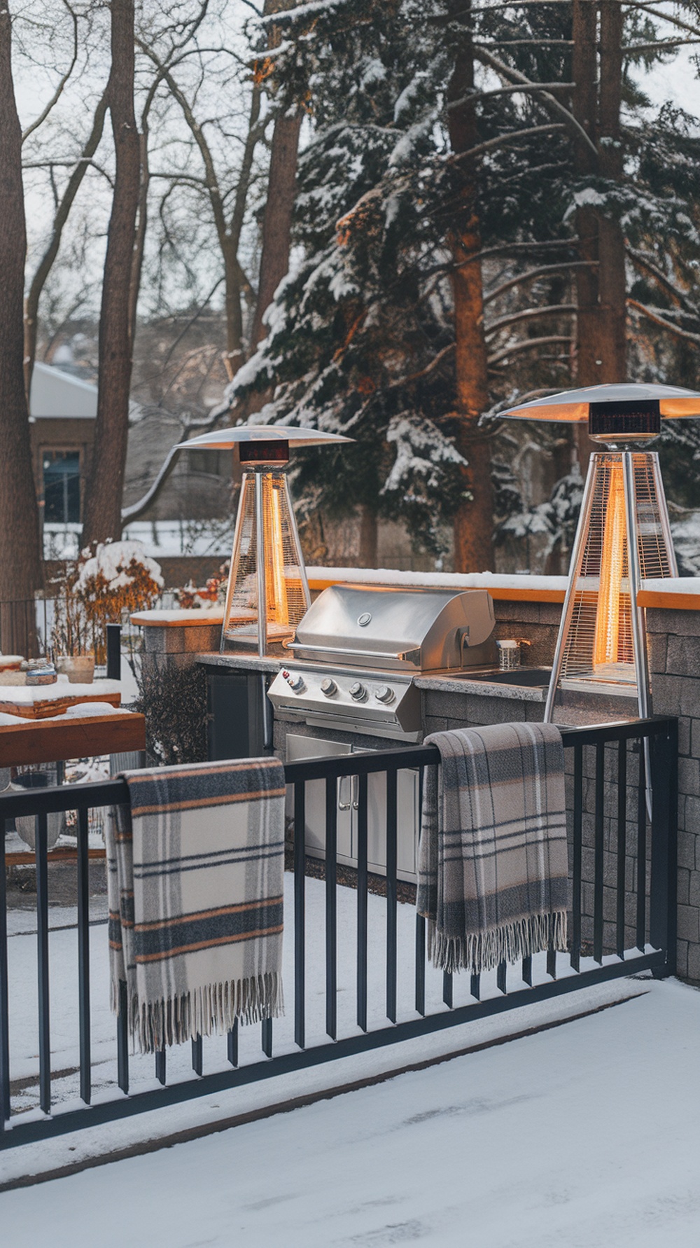 Picture this: a cozy outdoor kitchen, even in the heart of winter. This setup is perfect for those chilly nights when you still want to enjoy the great outdoors. The sleek grill shines under the soft glow of stylish heating lamps, making it inviting despite the snow-covered surroundings.