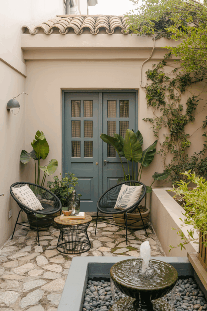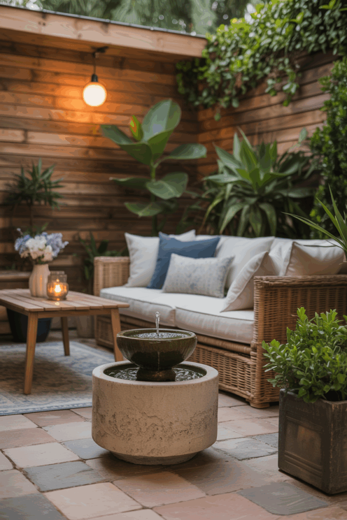 Incorporating a water feature like this not only beautifies your patio but also attracts birds and butterflies, bringing nature closer to home. It’s a simple way to elevate your outdoor experience.