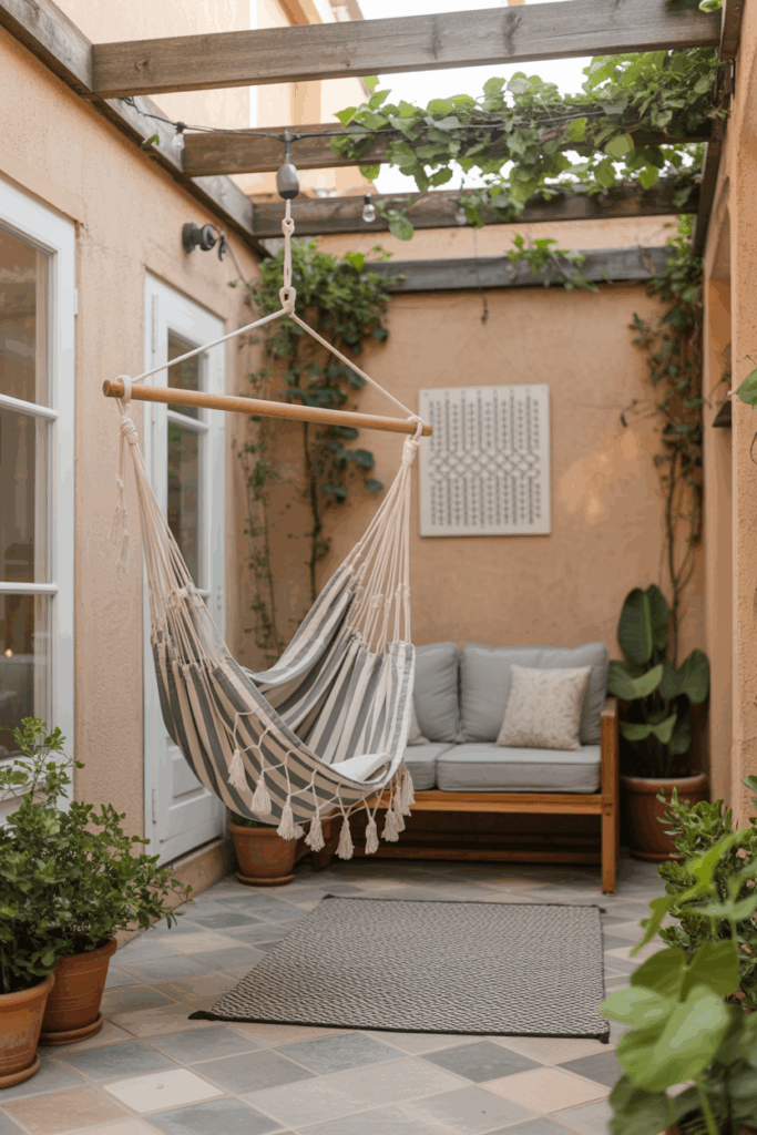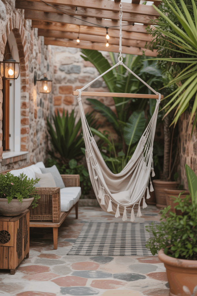 A hammock can turn a small outdoor patio into a cozy retreat. Imagine lounging in a soft, woven hammock, surrounded by greenery. This setup invites relaxation and offers a perfect escape from daily stress.