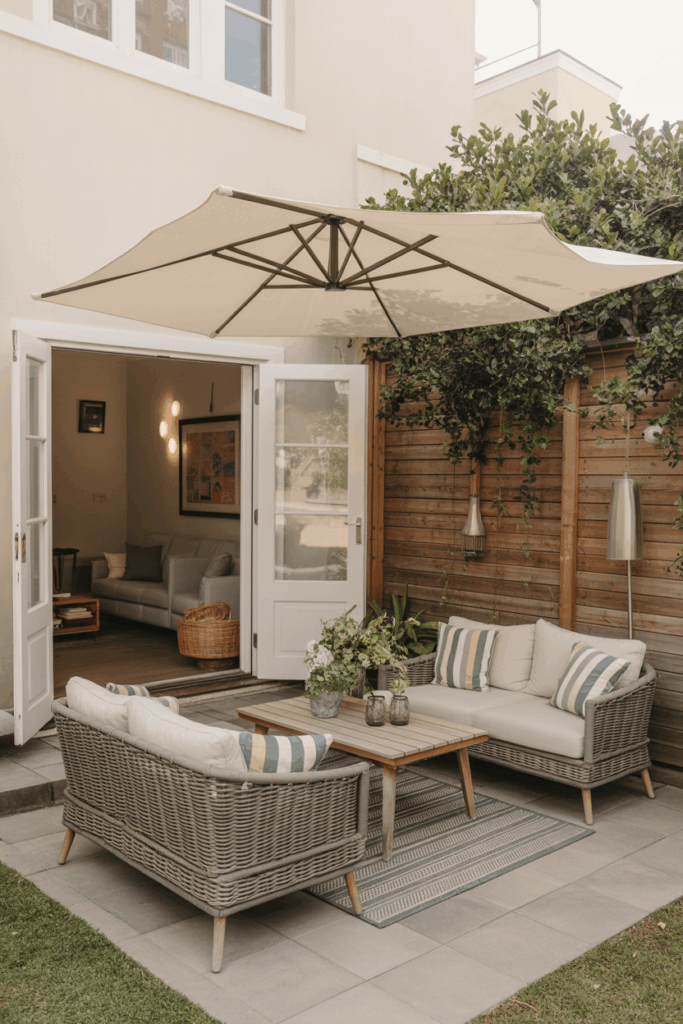 Adding a colorful outdoor rug can instantly brighten up your patio. In the image, the vibrant rug contrasts beautifully with the neutral tones of the surrounding space. It creates a cozy area that invites relaxation and conversation.