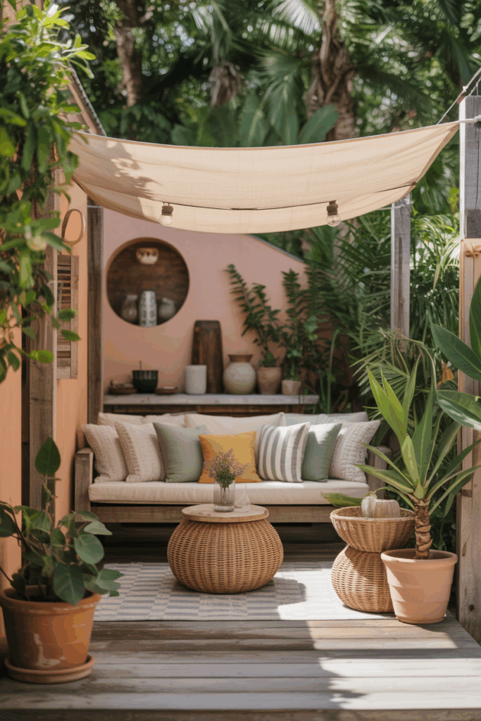 Choosing a canopy in warm colors, like the one shown, can create a welcoming atmosphere. It not only protects from the sun but also adds a pop of color to your space. This setup is ideal for those who want to enjoy their outdoor area without worrying about the heat.