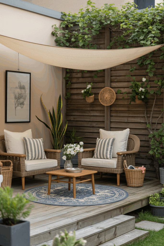 Creating a cozy outdoor space can be simple and fun. A shade canopy is a perfect way to add comfort and style to your small patio. The image shows a lovely setup with a stylish canopy that provides relief from the sun. This makes it an inviting spot for relaxing or entertaining.