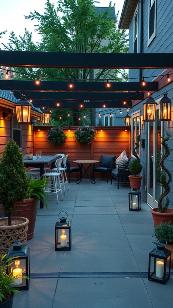 Outdoor lanterns can transform a small patio into a cozy retreat. The image shows a lovely patio adorned with elegant lanterns that create a warm glow. These lanterns are perfect for adding charm and character to your space.