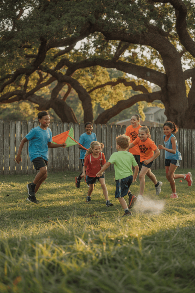 The kids are dressed casually, ready for some fun. Their expressions show determination and joy, capturing the spirit of friendly competition. This twist on Capture the Flag encourages teamwork and strategy, as players must work together to outsmart their opponents while maneuvering through the obstacles.
