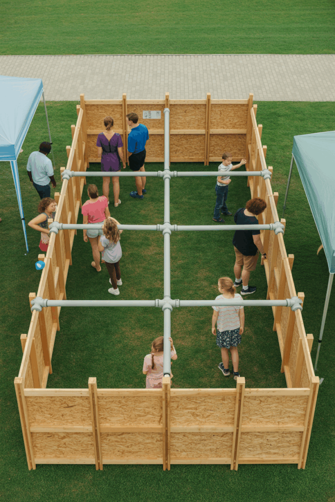 Obstacle courses are a fantastic way to get everyone moving and having fun. They are perfect for outdoor parties, bringing out the competitive spirit in a friendly way. In the image, you can see a variety of challenges that participants tackle, from climbing walls to crawling through tunnels.