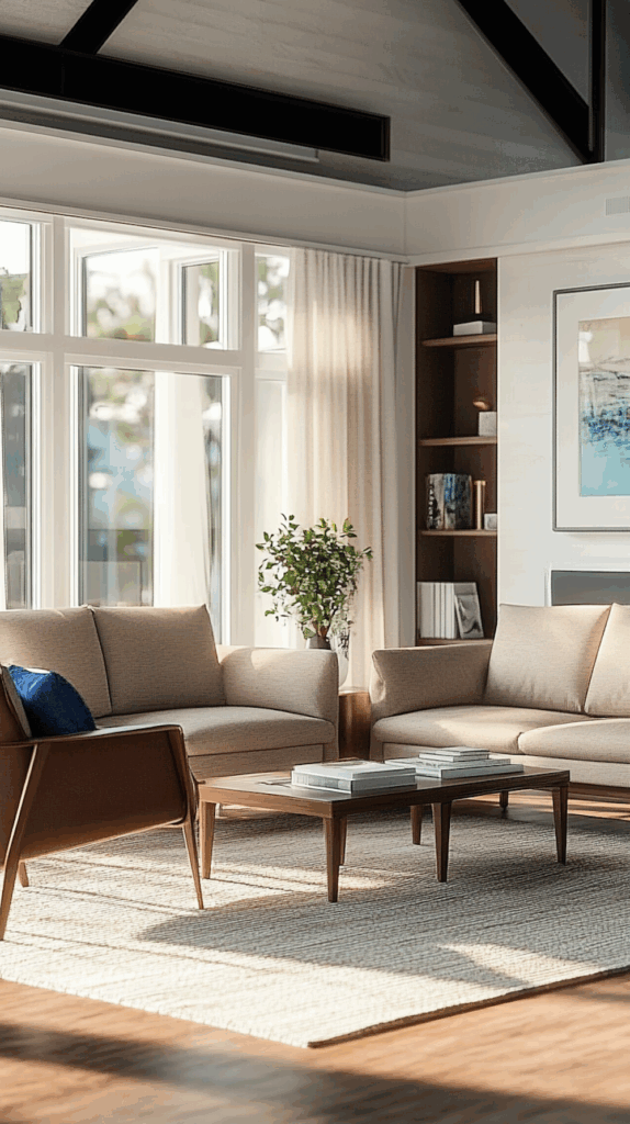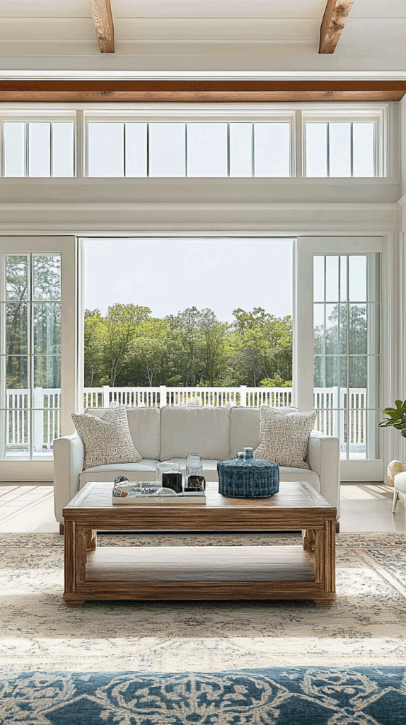 Wooden blinds add a natural, warm touch to a coastal living room. They help filter sunlight gently, creating a soft, inviting glow inside.