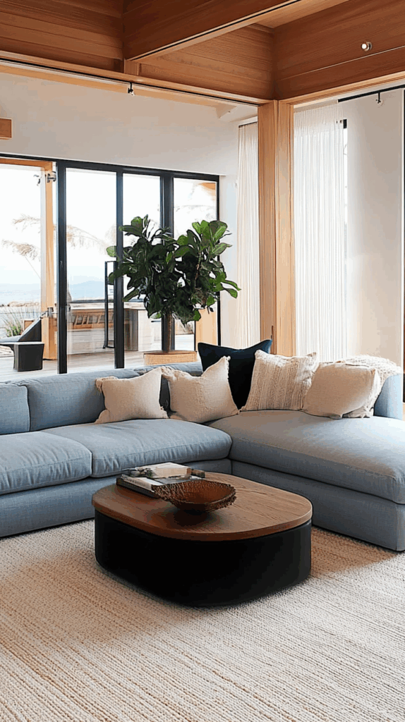 Soft blue tones work beautifully in coastal living rooms, instantly evoking the calm and serenity of the sea. Incorporating these hues through larger furniture pieces like sofas, accent chairs, or ottomans helps create a soothing foundation, while cushions in pale blue or seafoam shades add layers of comfort and style. These gentle colors pair perfectly with crisp whites, sandy neutrals, and natural textures, making the room feel airy, bright, and connected to coastal surroundings.