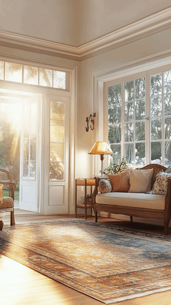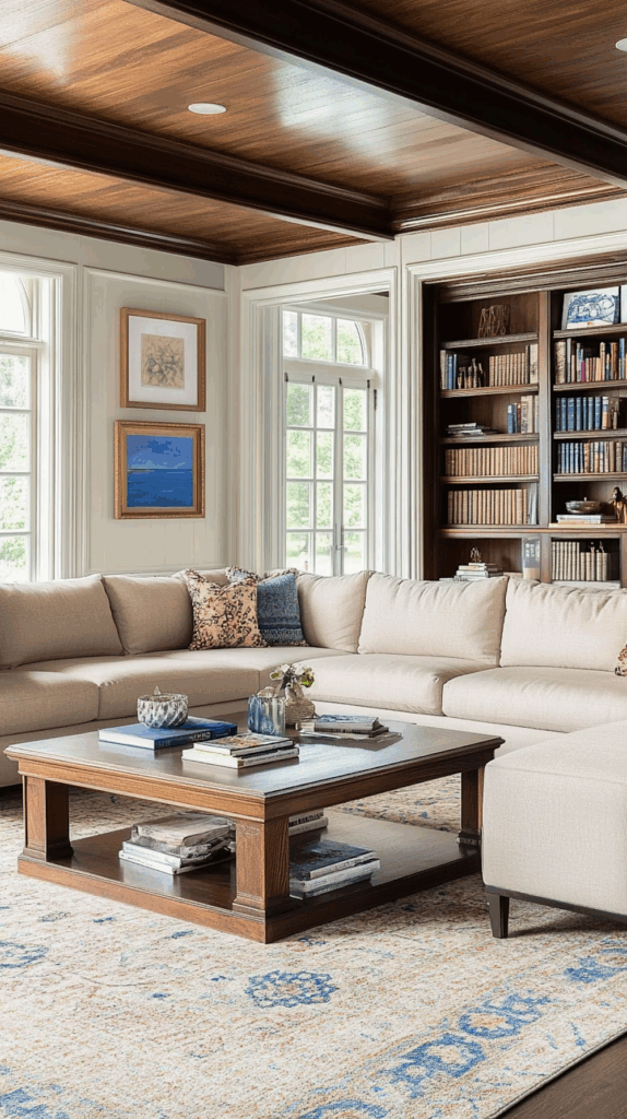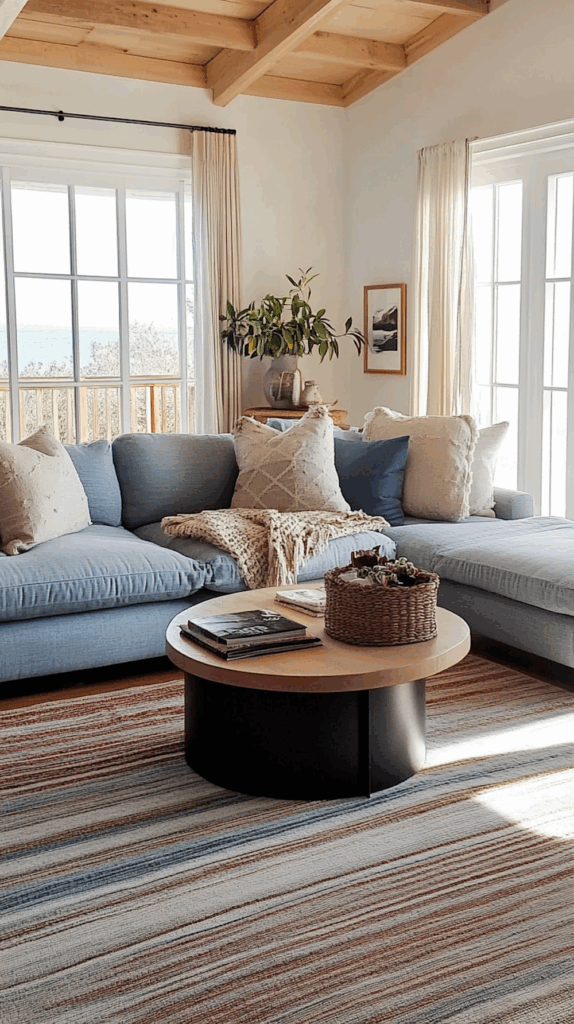 A rug with soft, understated stripes adds warmth and texture underfoot, tying the entire room together while keeping the space bright and inviting. Pairing a striped rug with solid-colored furniture, natural wood accents, and woven textures like rattan or jute creates a relaxed, beach-inspired aesthetic that feels effortless yet curated. The combination of clean lines, neutral tones, and nautical influence gives your coastal living room a timeless look that will never go out of style.