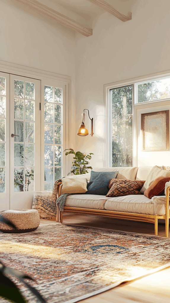 - Neutral and natural palettes with rattan, driftwood, and linen