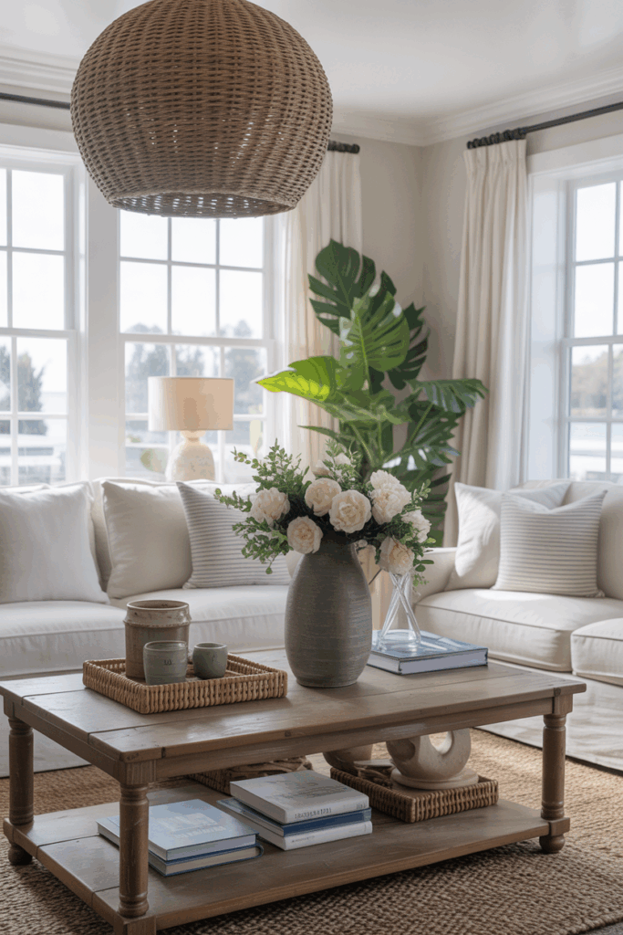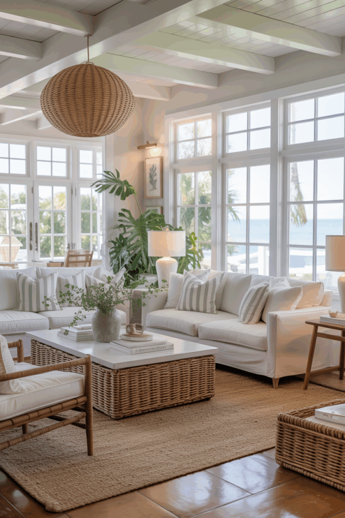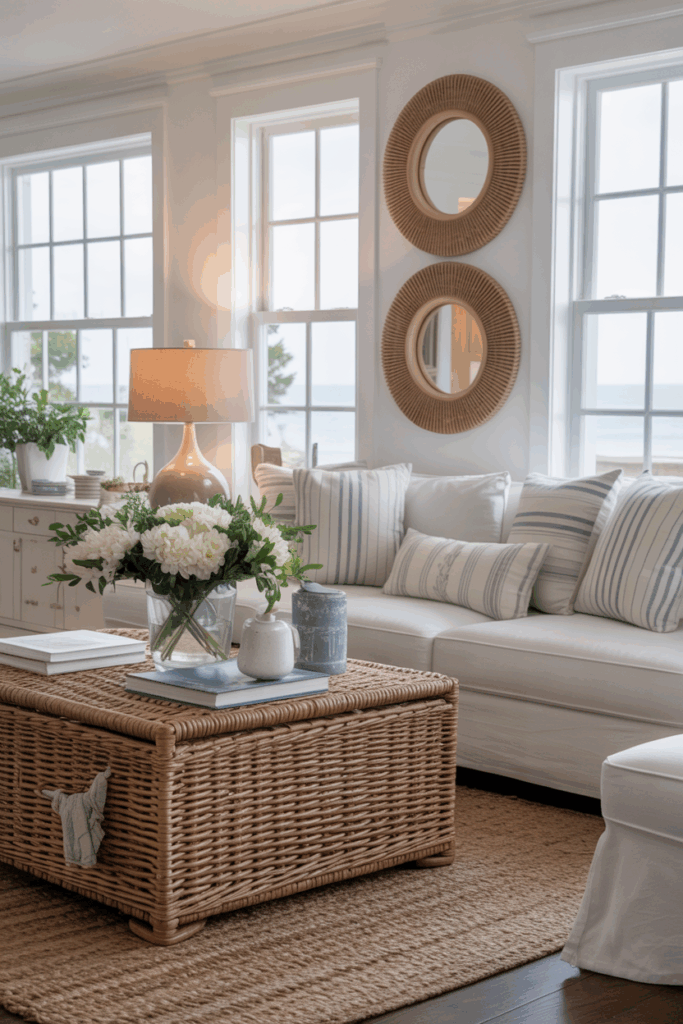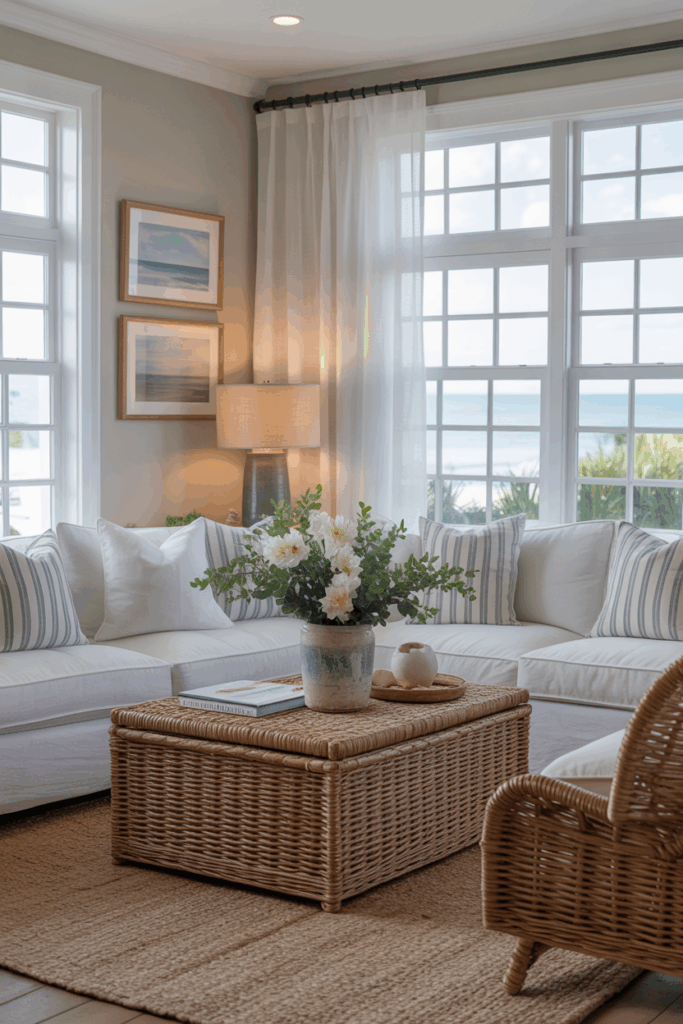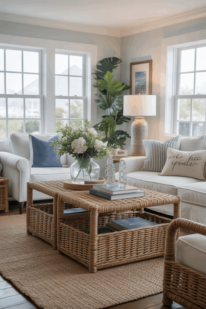 Textured items add depth to a coastal living room, making the space feel layered and welcoming. Woven baskets not only provide practical storage but also bring natural texture and visual interest, reinforcing a relaxed seaside vibe. Jute rugs add warmth underfoot while introducing an organic, earthy element that softens bright, airy interiors.