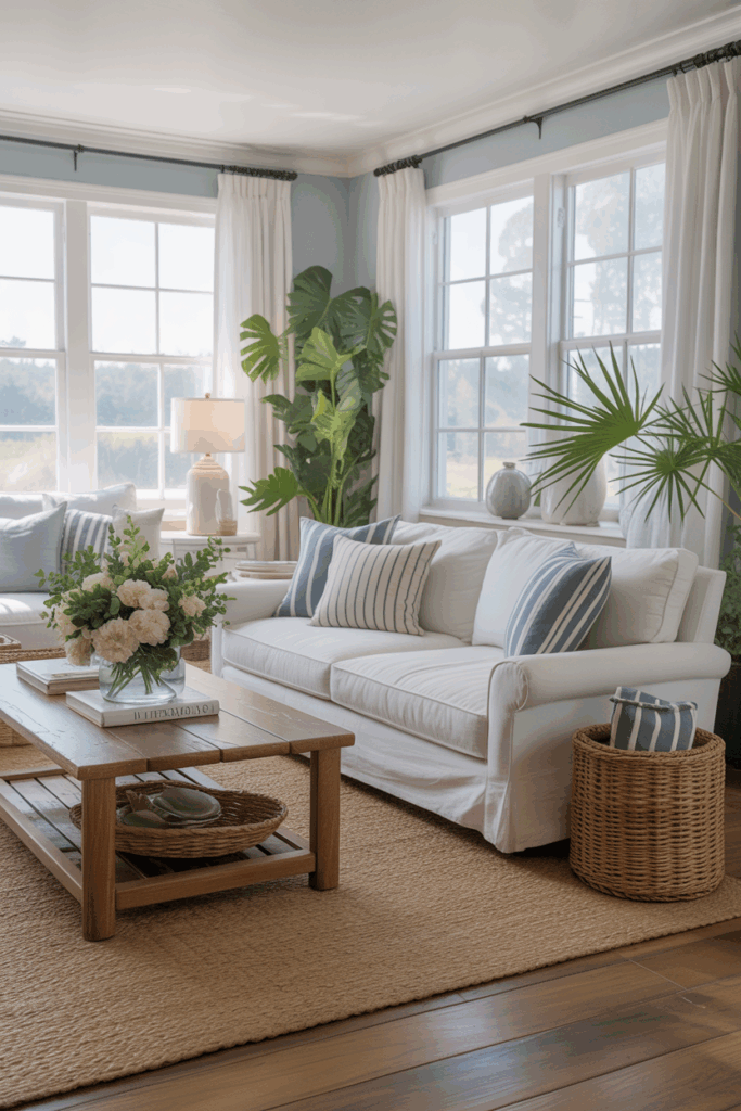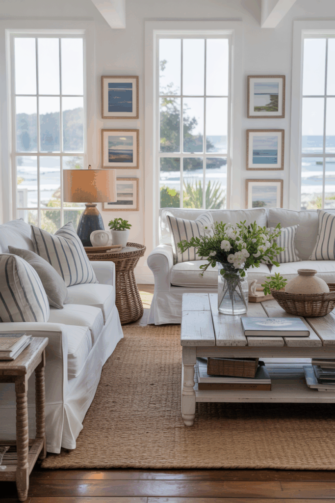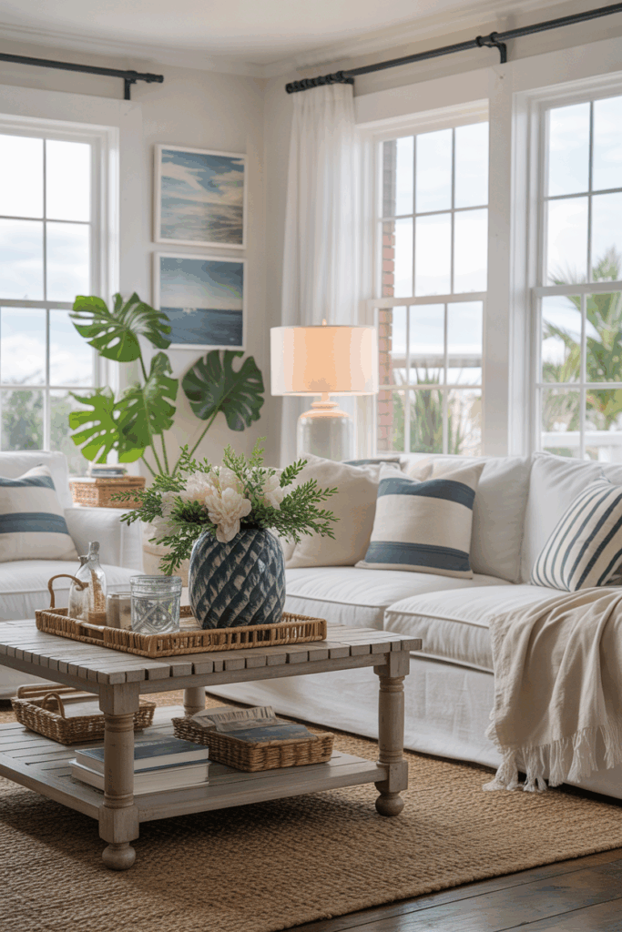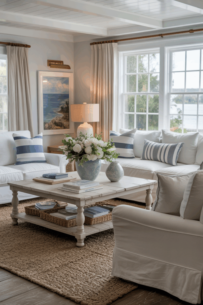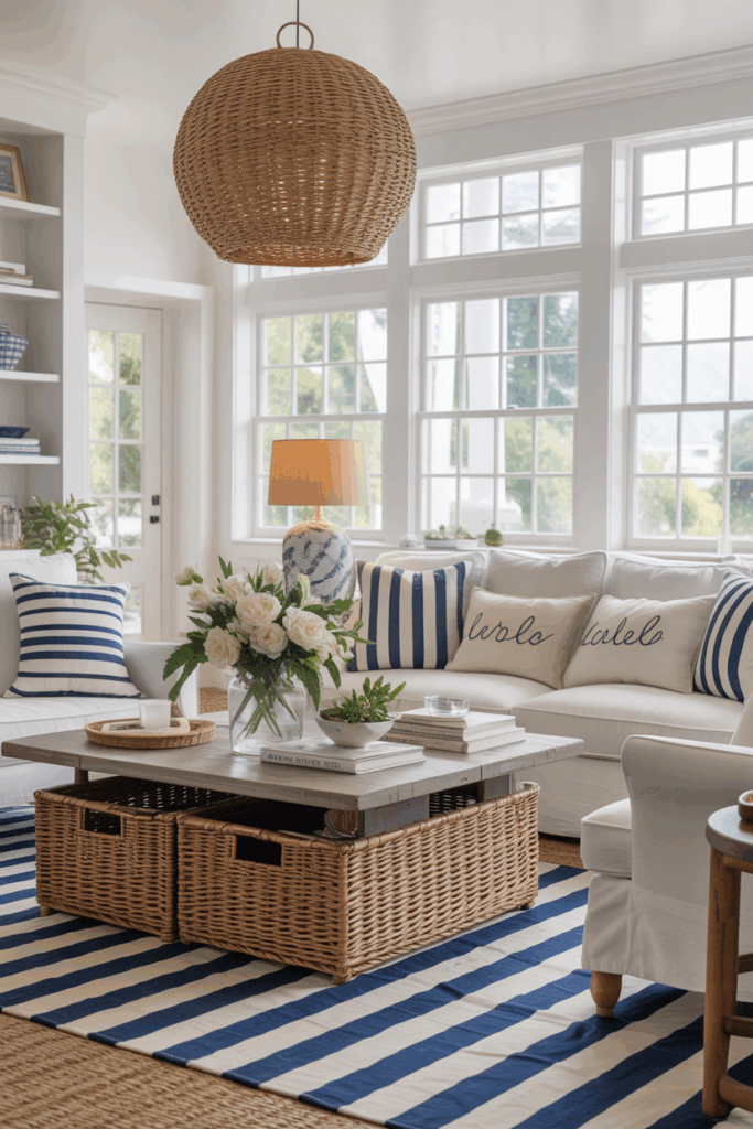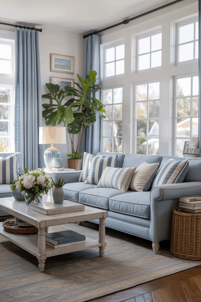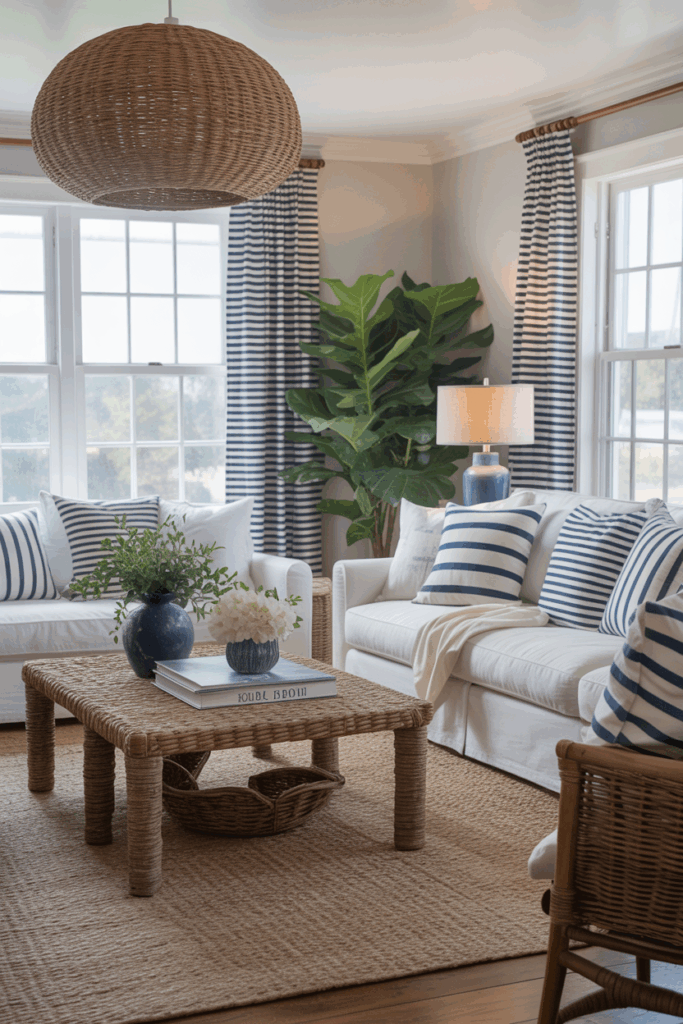 Stripes are a timeless way to add a coastal touch to your living room without overwhelming the space. Classic navy and white striped cushions or curtains create a subtle maritime vibe that feels fresh, clean, and elegant. This simple pattern pairs beautifully with soft neutral palettes and natural materials, helping your room feel open and airy while still grounded in coastal style. Incorporating stripes in smaller accessories also makes it easy to refresh your decor seasonally without a complete redesign.