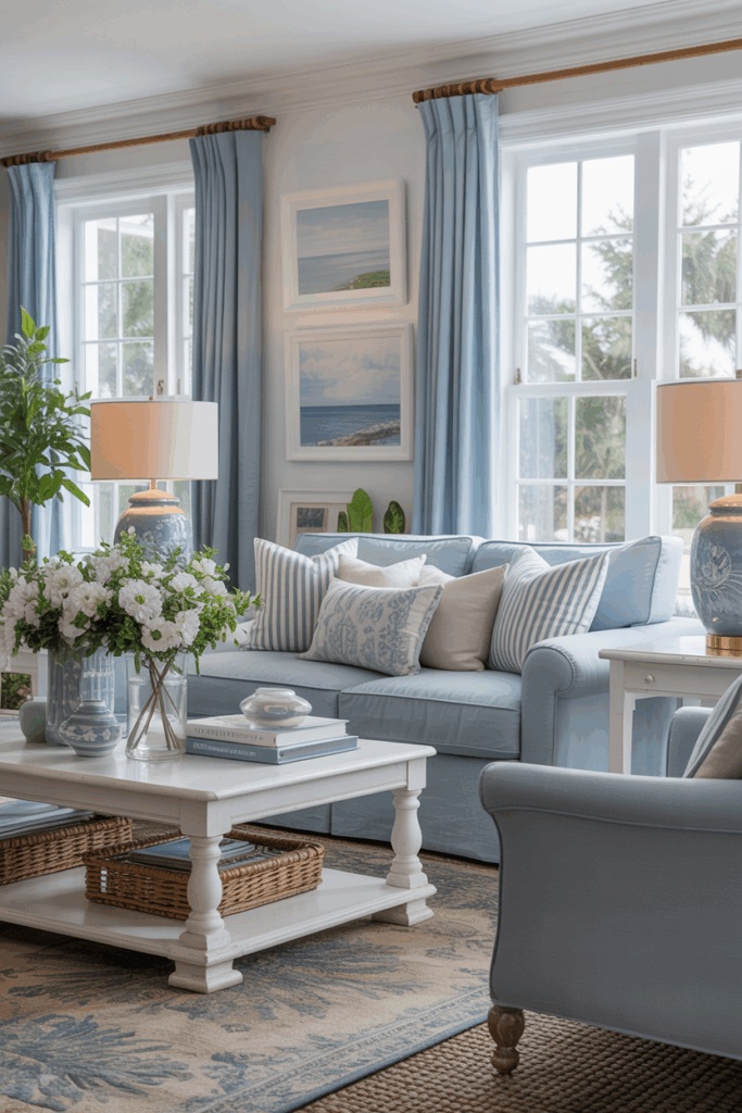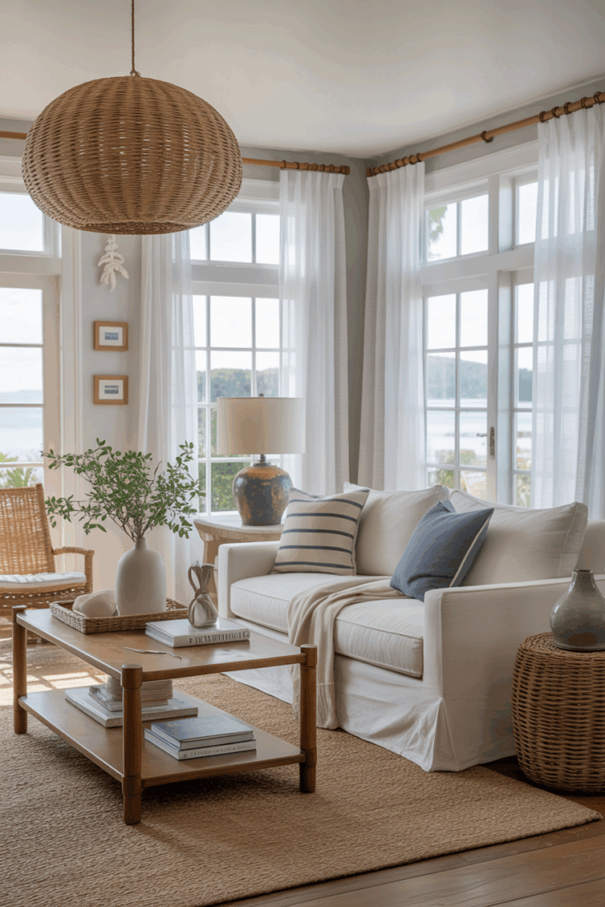 Sheer curtains help bring in natural light while maintaining a sense of privacy, making them a perfect choice for coastal living rooms. Their soft, lightweight design creates an airy and open feel, allowing sunlight to filter gently through the space and brighten every corner. Fabrics like linen and cotton are ideal for this look, as they have a natural, breezy texture that flows beautifully with the slightest movement of air, enhancing the room’s relaxed and beach-inspired vibe.