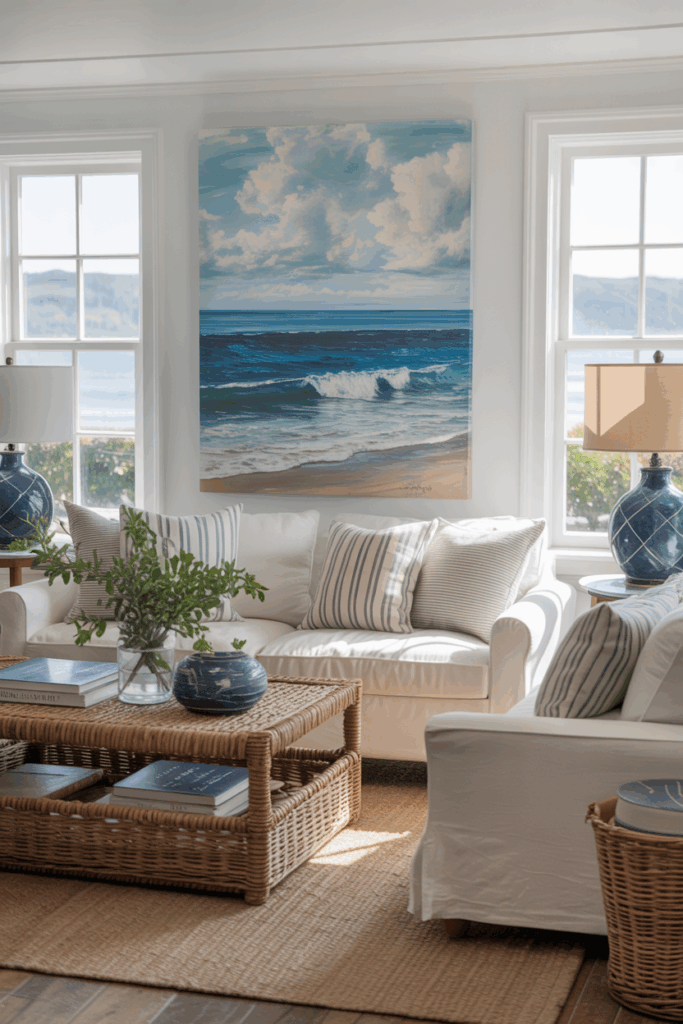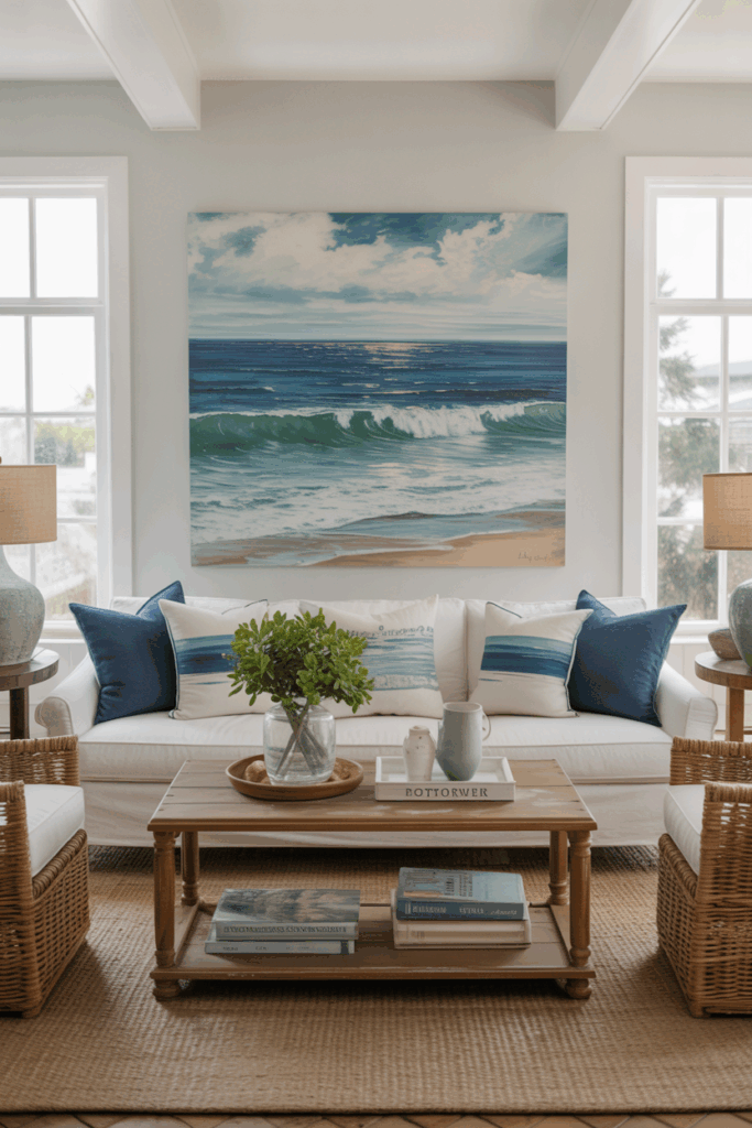 Blue artwork is another simple yet effective way to bring a coastal influence into your home. Pieces featuring ocean landscapes, sailboats, seashells, or abstract shades of blue mimic the calming hues of the sea, instantly brightening a space and making it feel open and airy. Hanging artwork above a sofa or fireplace also draws the eye upward, helping rooms feel larger while emphasizing natural light. Together, blue pillows and art bring a cohesive design element that ties the space to a coastal theme, allowing you to achieve that breezy, beach-inspired look without the need for a full room renovation. This approach creates a calm, light-filled atmosphere that feels like a seaside retreat while remaining timeless and versatile.