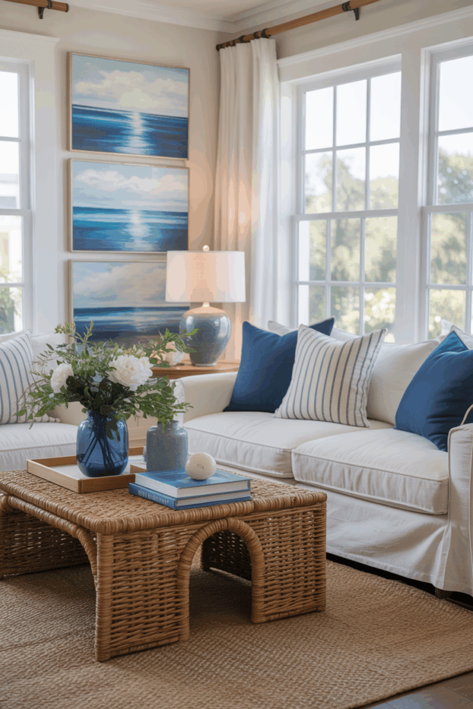 Using multiple shades of blue throughout accessories like throws, rugs, curtains, and artwork adds visual depth and dimension, creating a layered, designer-inspired look. From navy to sky blue, this variation mirrors the natural gradation of ocean waters, enhancing the sense of balance and flow in the space. Pairing blues with materials like jute, rattan, or driftwood accents ties the entire room together, resulting in a timeless, beachy atmosphere. This thoughtful mix of colors and textures makes the room feel both relaxing and sophisticated, transforming it into a seaside-inspired retreat.