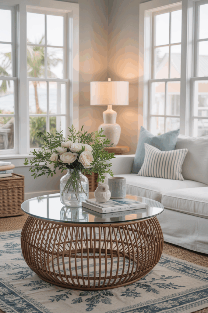 A round glass coffee table with a rattan base is a perfect choice for coastal living rooms, combining natural textures with a clean, modern look. The glass top creates an airy, open feel that helps smaller spaces appear larger and brighter, while the rattan base adds warmth and a relaxed, beachy vibe. This balance of sleek glass and organic materials makes the table a versatile piece that complements both contemporary and traditional coastal decor.