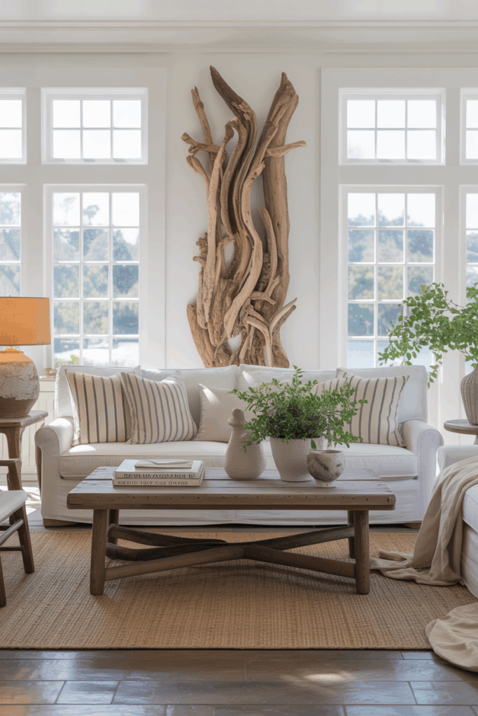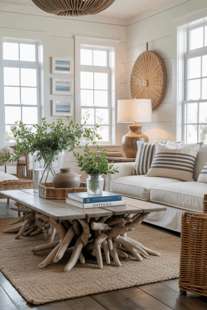 Driftwood coffee tables add a rustic, natural touch to coastal living rooms. They bring texture and warmth that connect the space to the beach environment.