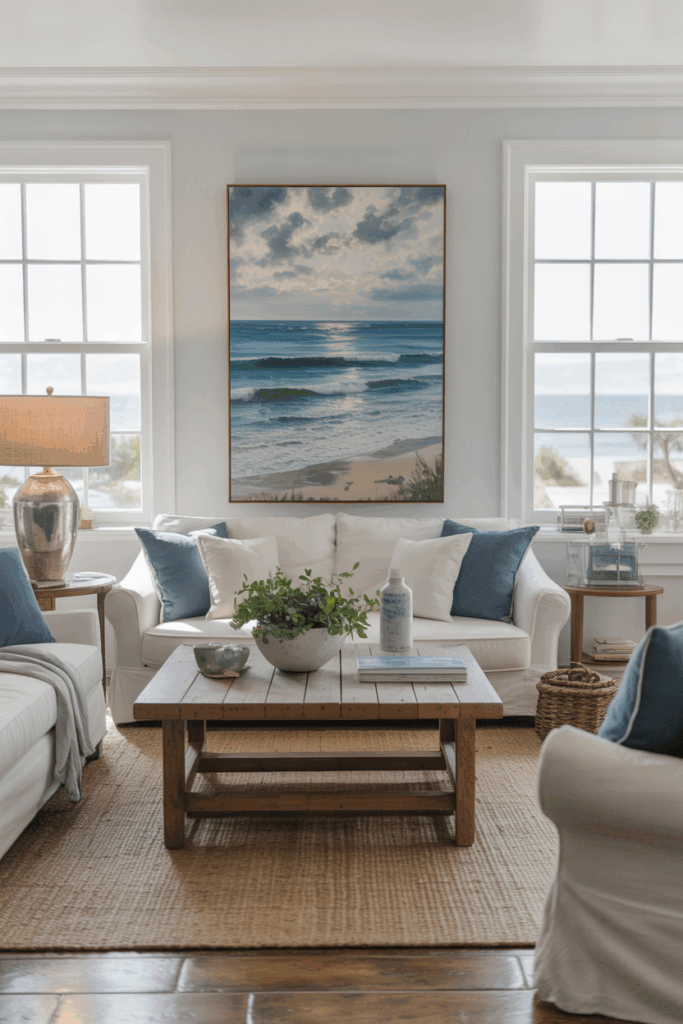 Framed ocean art is a versatile choice for a coastal living room, as it pairs effortlessly with both modern and rustic styles. A single large piece can create a stunning focal point, while a curated gallery wall featuring multiple smaller prints adds visual interest and personality to your space. Choosing artwork in shades of blue, soft greens, and sandy neutrals creates harmony with other coastal elements, helping the entire room feel cohesive and inviting. Whether you prefer photography, watercolor paintings, or abstract interpretations of the sea, ocean-inspired artwork offers a timeless way to reflect the relaxing vibe of seaside living while maintaining a polished and stylish aesthetic.