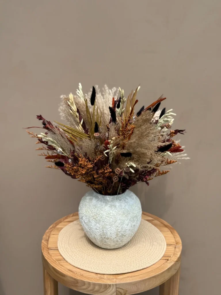 This neutral fall flower arrangement brings cozy fall charm to your space. Perfect for mantels, shelves, or your entryway.