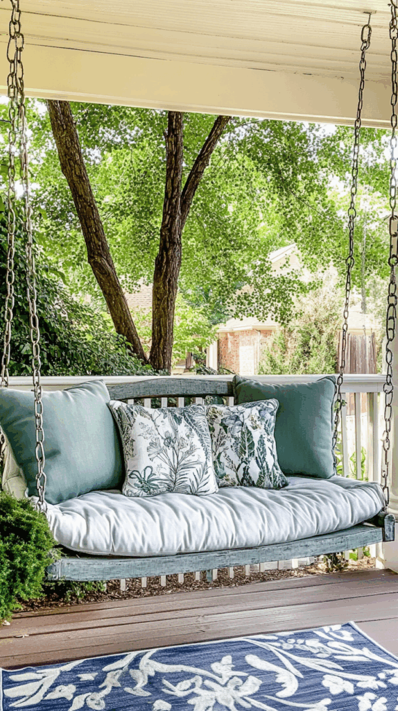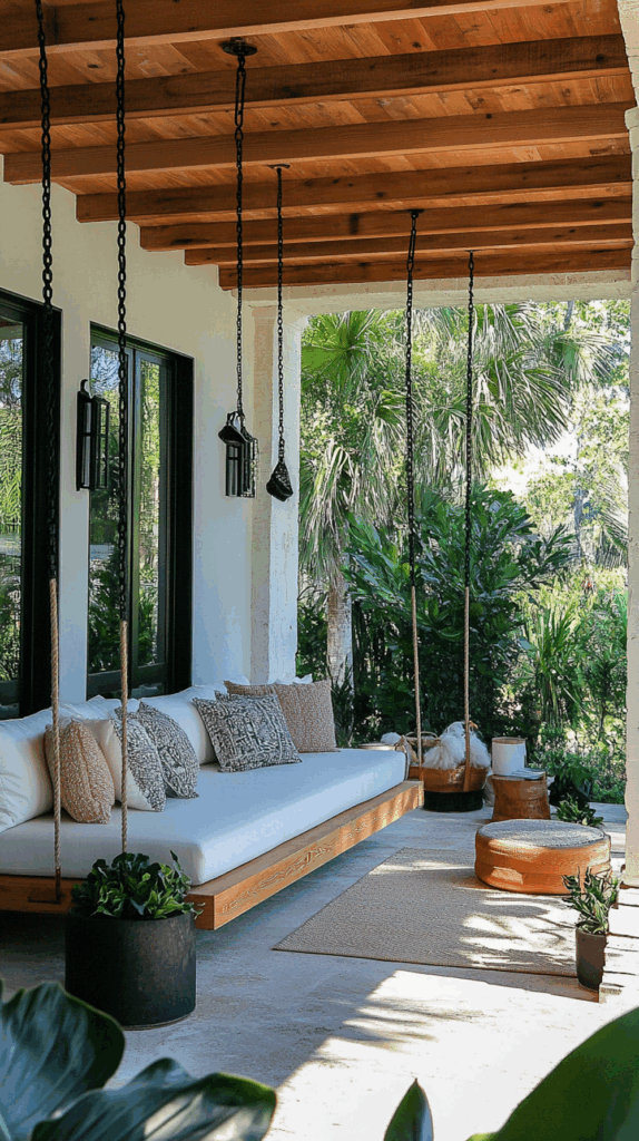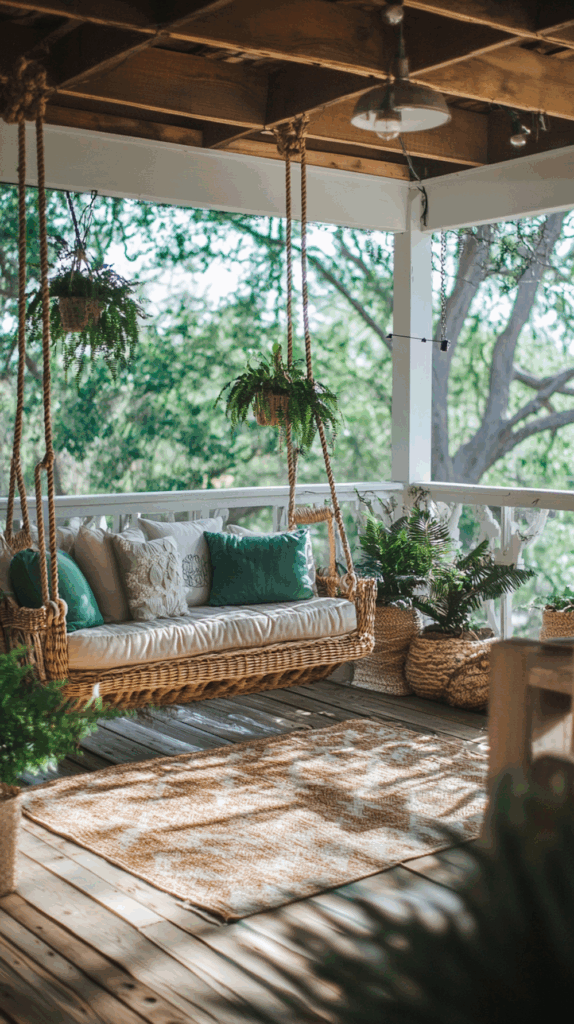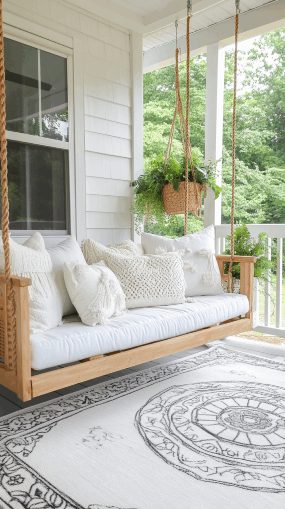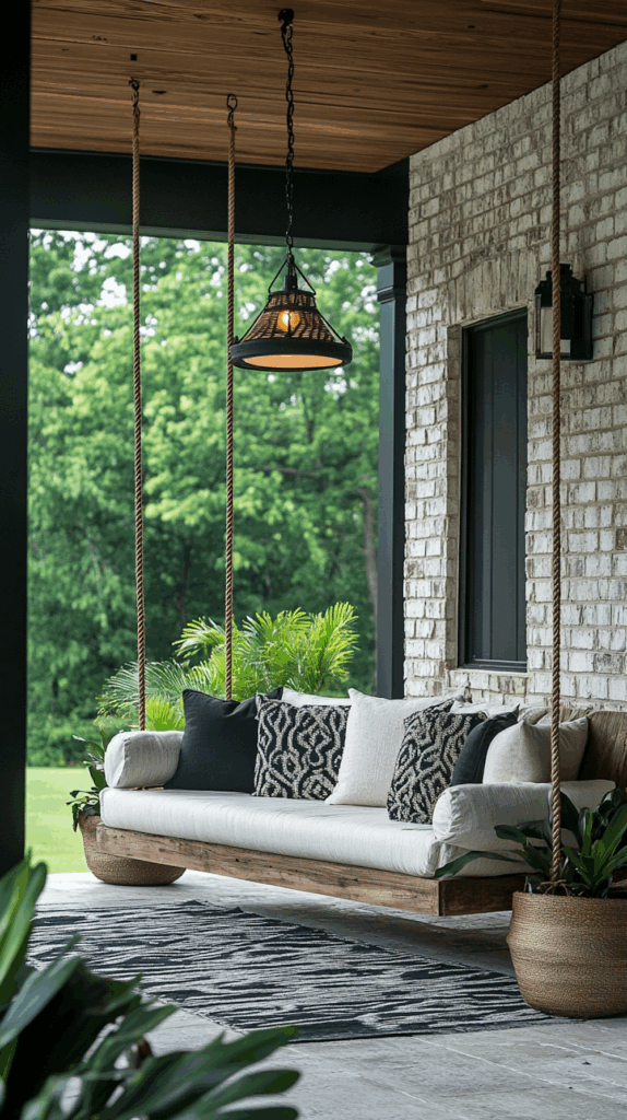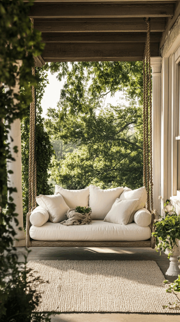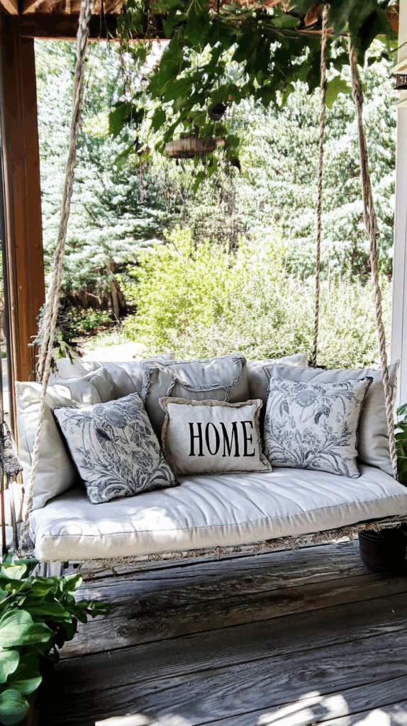- Wooden porch swings with chains – classic charm for farmhouse homes