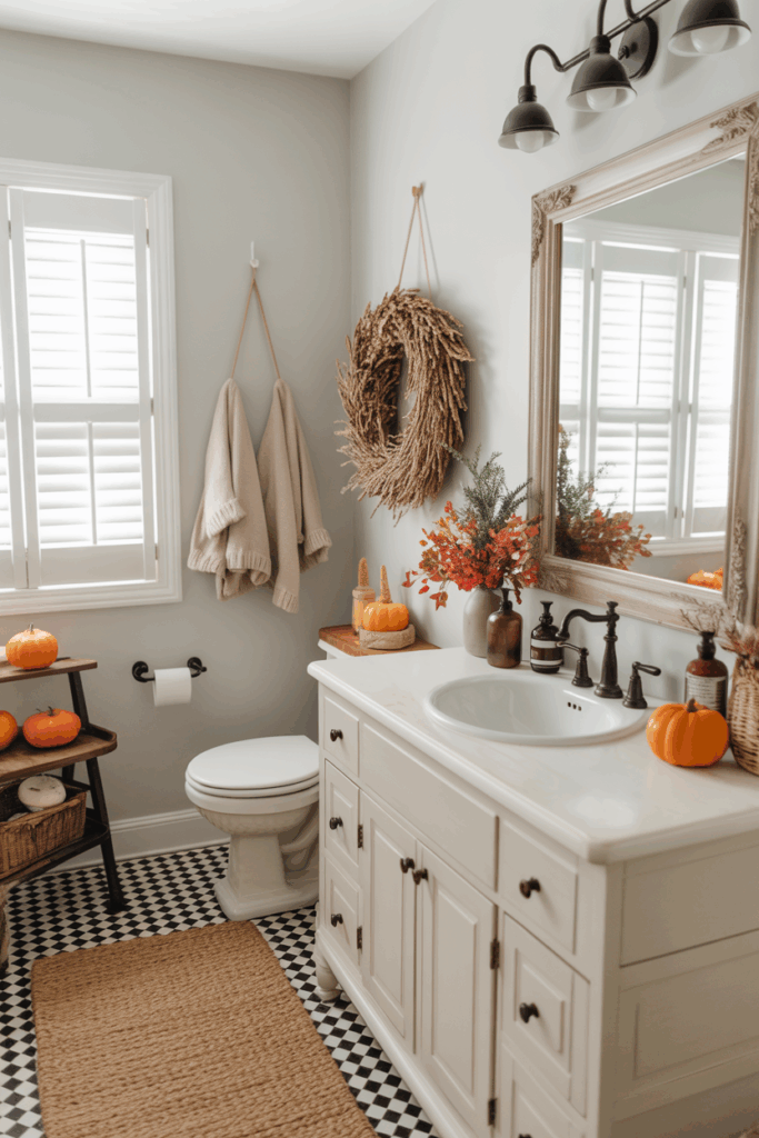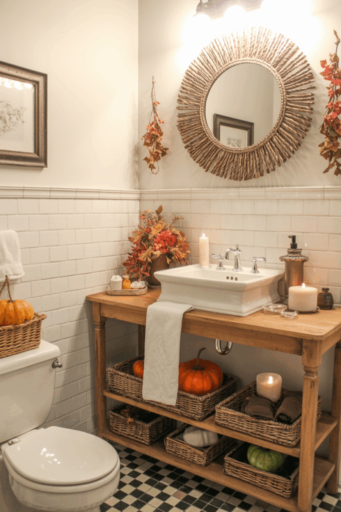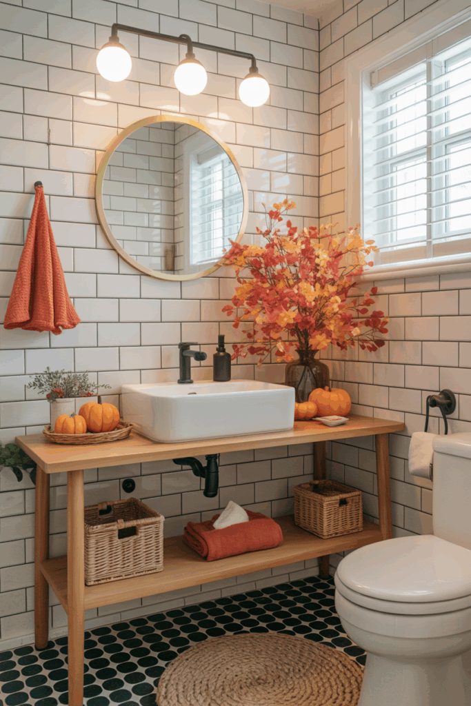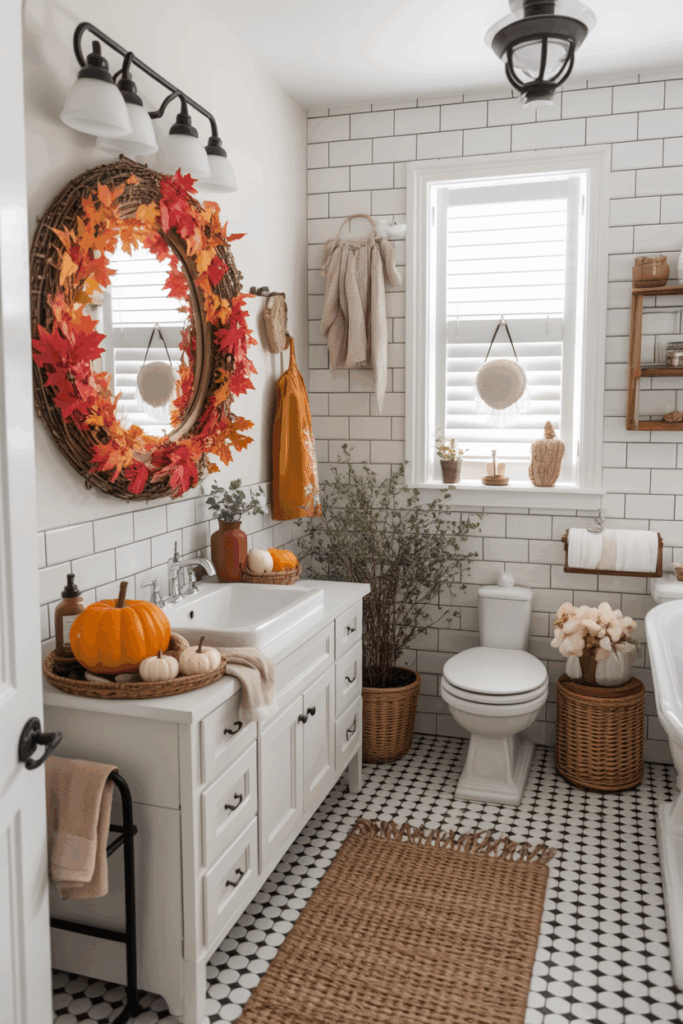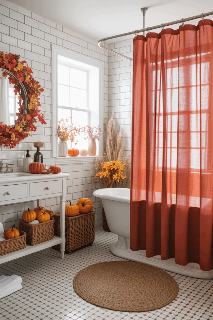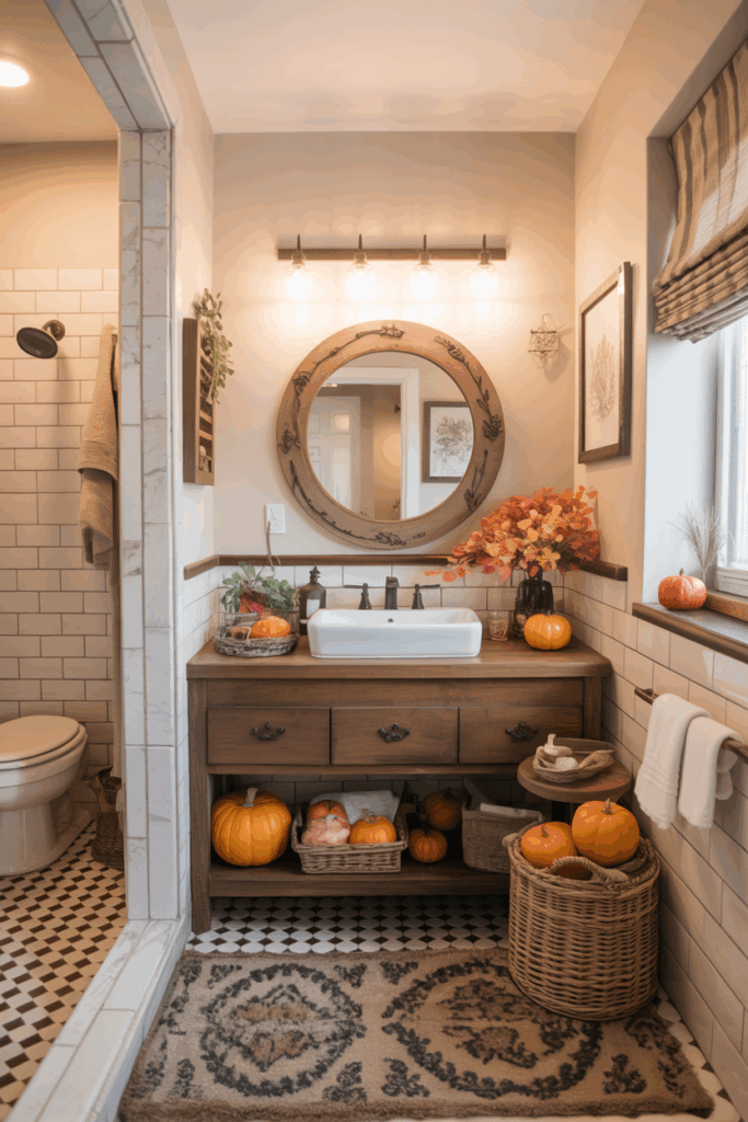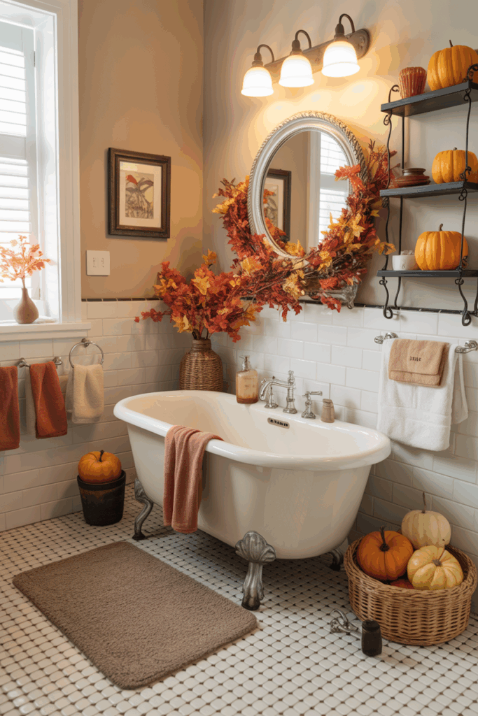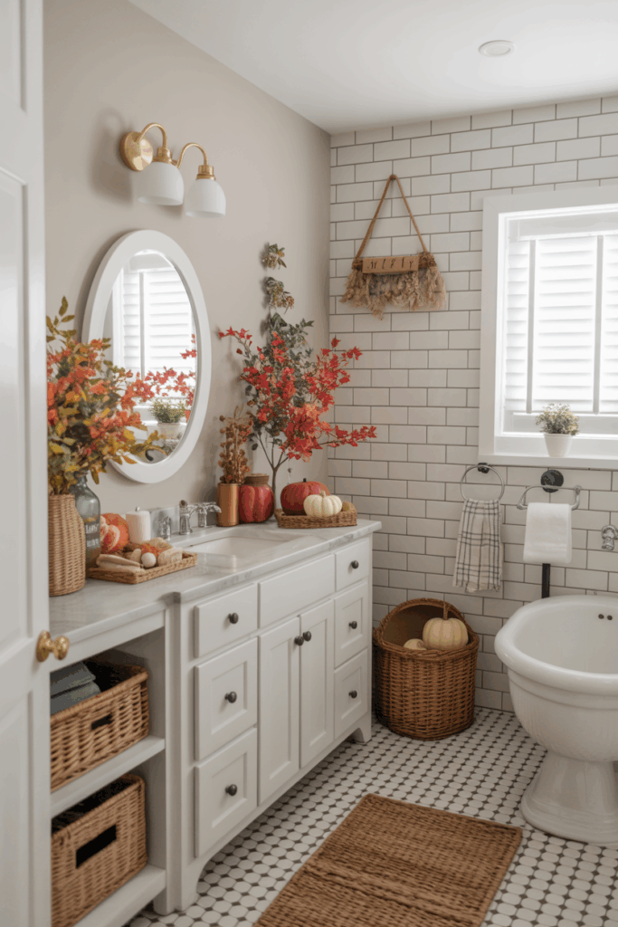 If you have a larger bathroom with a bench, window seat, or reading corner, embrace the season by styling it like a cozy autumn nook. Add a soft plaid throw, a fall-scented candle, a woven basket for magazines or books, and a pumpkin or two. This turns your bathroom into a fall sanctuary — perfect for relaxing after a long day.