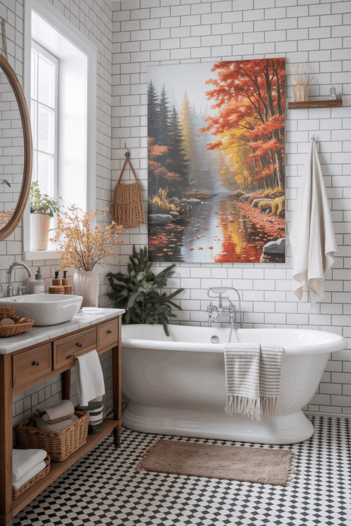 Art is one of the easiest and most impactful ways to infuse your bathroom with a seasonal vibe, and autumn-themed artwork can instantly shift the mood from everyday to cozy and inviting. Because bathrooms are often small spaces, even a single framed piece can set the tone. Look for prints, paintings, or photographs that feature fall landscapes, colorful leaves, pumpkins, or harvest scenes. Botanical illustrations of acorns, gourds, or fall florals can also add an elegant seasonal touch.