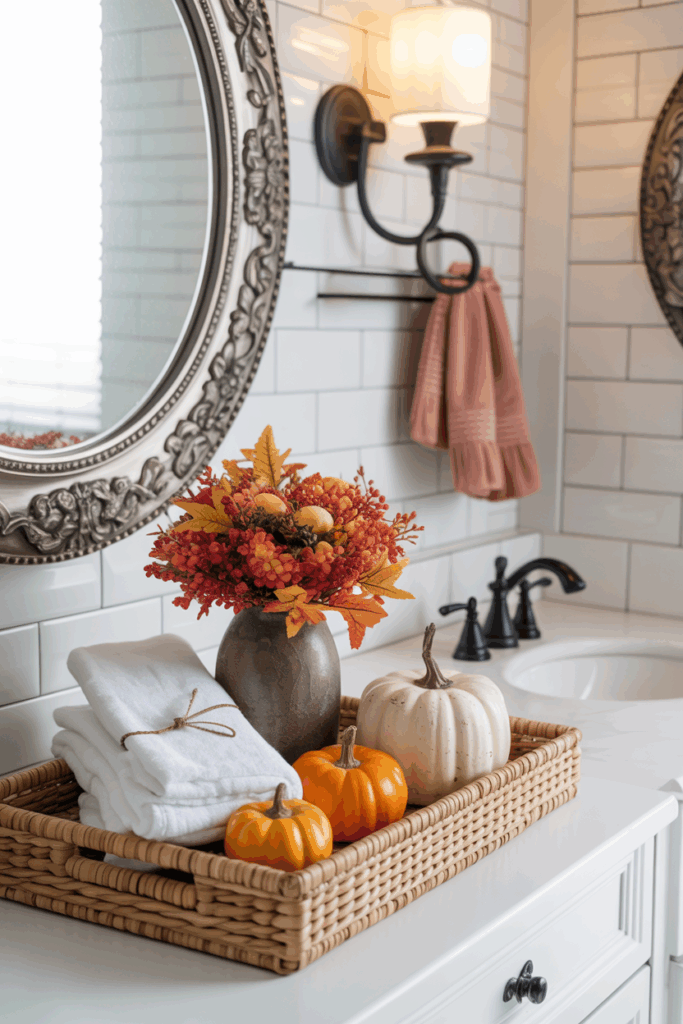Your vanity or sink counter is the perfect place for a seasonal vignette. Use a small tray to organize everyday items while adding fall style. Include a fall-scented candle, a tiny pumpkin, a decorative soap bar, or a mini vase with dried stems. Choose items in warm tones and natural textures to keep it cohesive and calming.