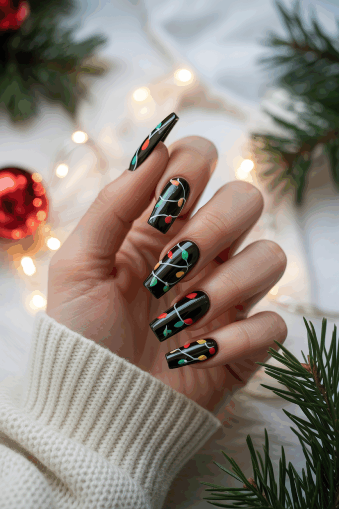 This design uses a black base color to make colorful Christmas lights stand out. The lights are painted as small, bright bulbs connected by thin, delicate lines. It creates a clean and festive look that is simple but eye-catching.