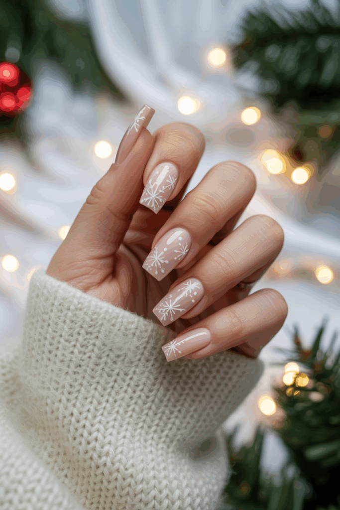 This design uses clear or natural nail parts to create a modern look. White snowflakes are painted over empty spaces for a crisp winter feel. It balances simplicity with festive style, making it a popular choice for holiday nails.