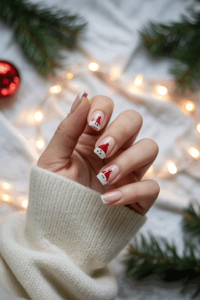 Santa hat nail art fits well on short nails. It uses simple red and white colors to create a festive look.
