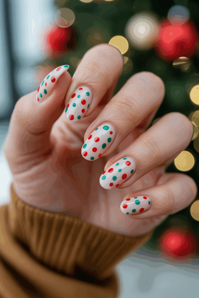 This design uses a green base with red and gold polka dots for a festive look. It combines classic Christmas colors without being too busy. The gold adds a subtle shimmer that makes the nails stand out neatly.