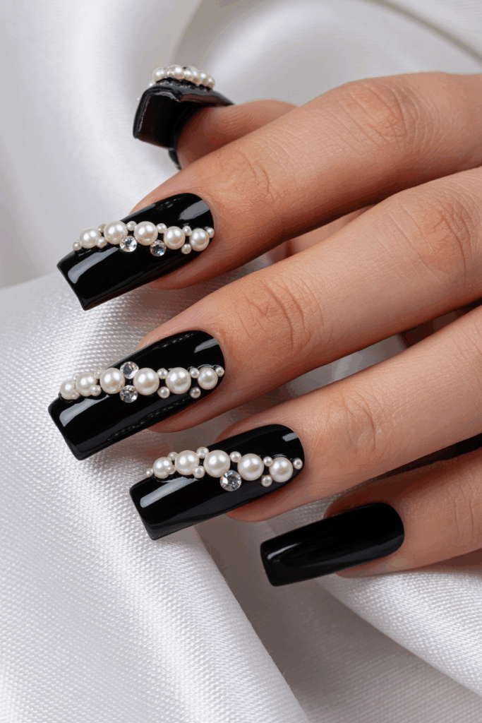 Black nails with pearl details offer a mix of boldness and elegance. The dark base makes the pearls stand out, creating a chic contrast.
