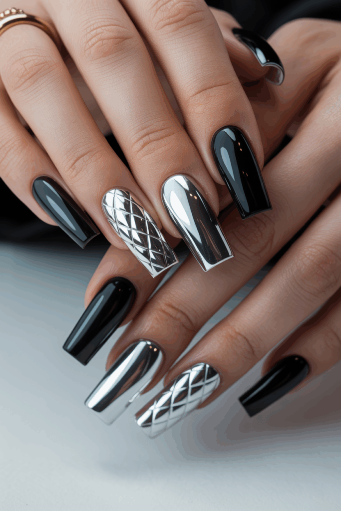 Black nails with chrome accents create a sleek and modern look. The shiny chrome contrasts well with the deep black, adding depth and interest.
