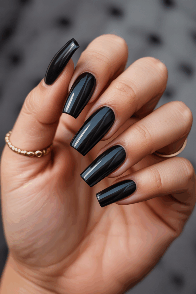 Black coffin-shaped nails have a sharp, tapered look that stands out. The shape resembles a coffin or ballet slipper, giving nails an elegant yet edgy feel.