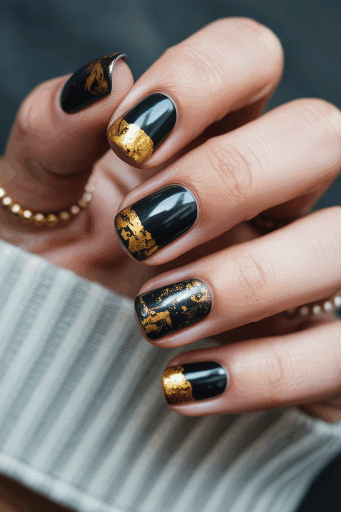 Gold foil on black nails fits many styles. It suits elegant, edgy, and trendy looks for various occasions.