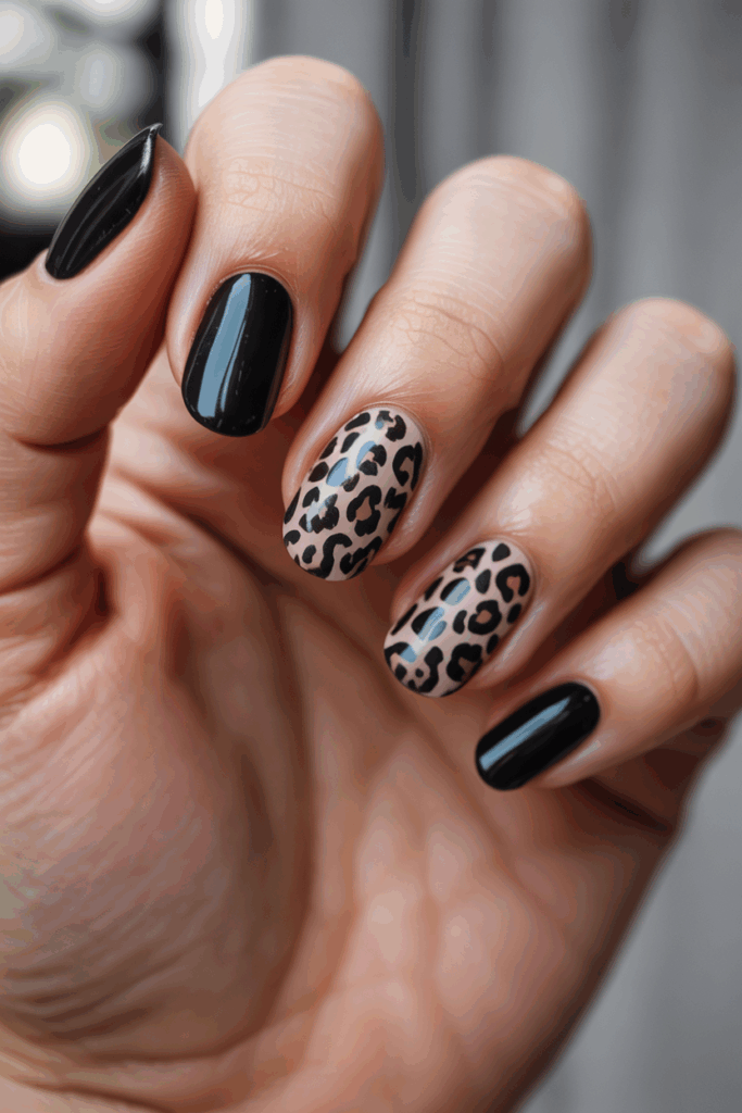 This design often uses gold or black spots to add contrast and texture. Some choose a mix of solid black nails with one or two leopard print accent nails for balance.