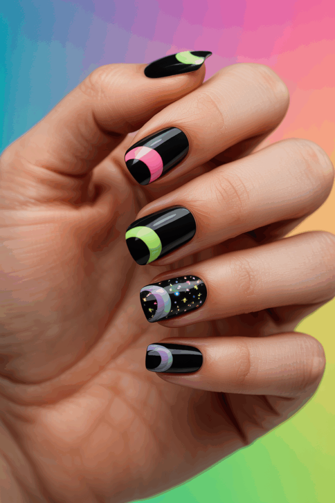 Black nails with neon accents create a sharp contrast that draws attention. The bright colors stand out against the dark base, giving a bold and modern look.